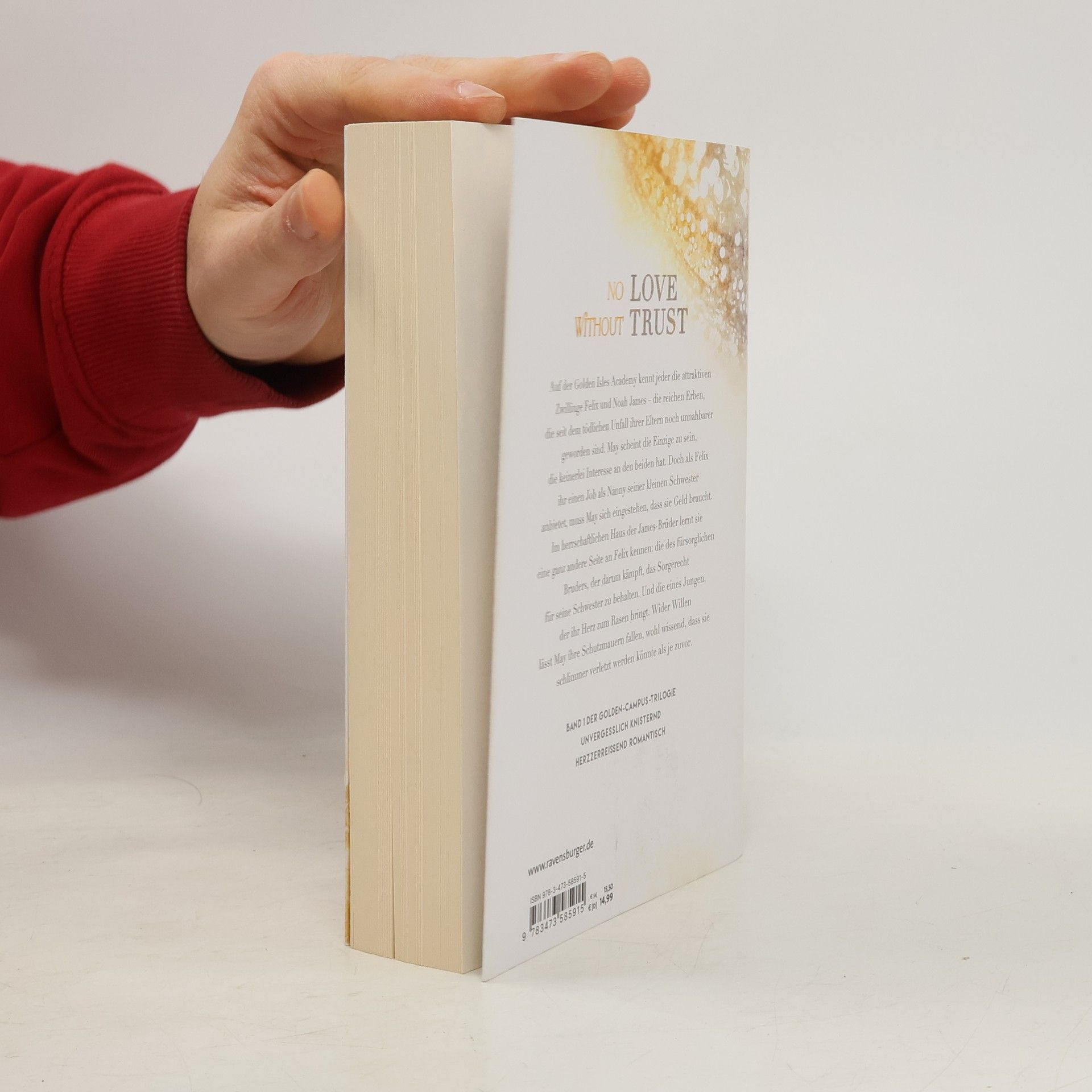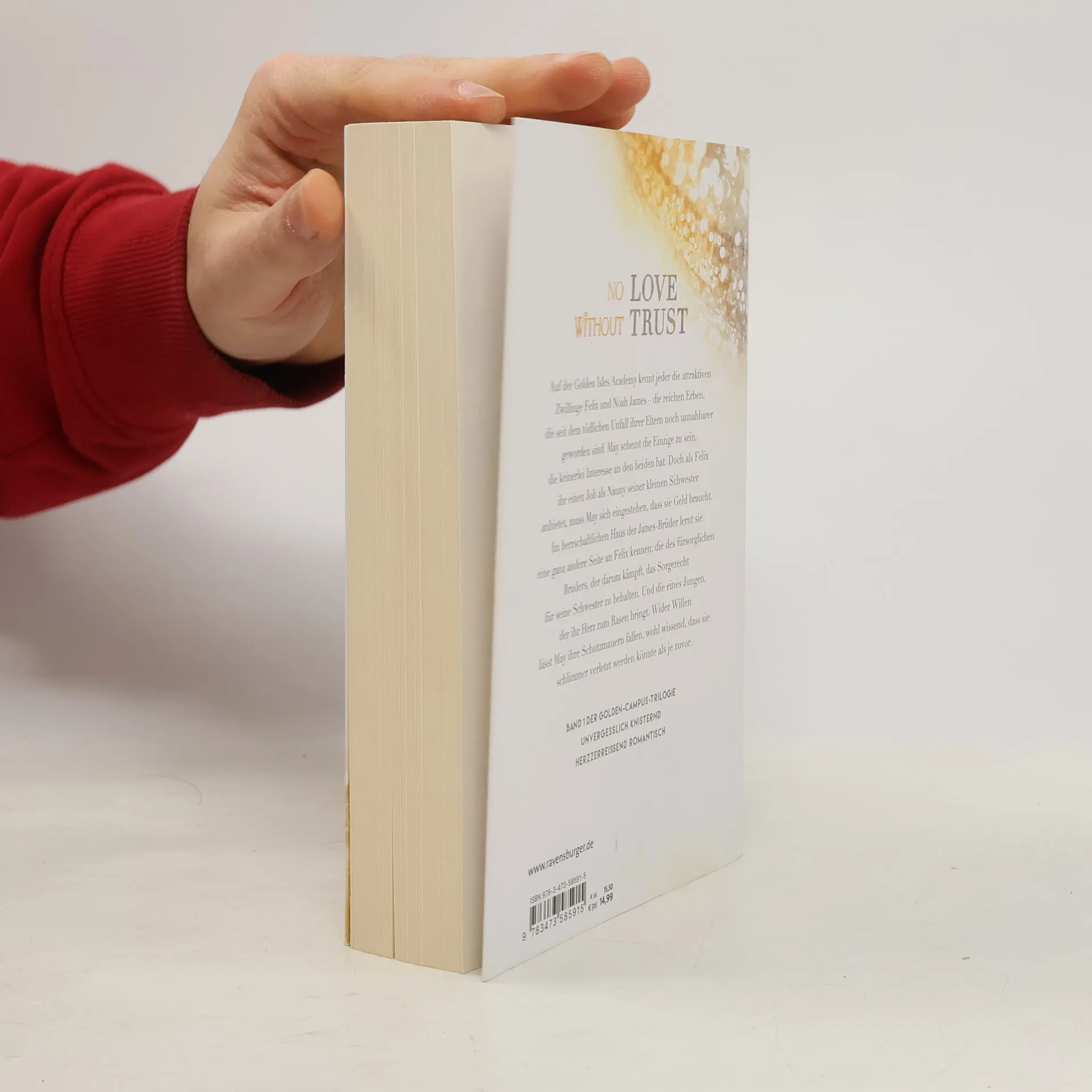 Auf der Golden Isles Academy sind die Zwillinge Felix und Noah James bekannt – reiche Erben, die nach dem tödlichen Unfall ihrer Eltern noch distanzierter geworden sind. May hingegen hat kein Interesse an ihnen. Doch als Felix ihr einen Job als Nanny für seine kleine Schwester anbietet, bleibt ihr nichts anderes übrig, als zuzustimmen. Bald entdeckt sie eine andere Seite von Felix: den fürsorglichen Bruder, der um das Sorgerecht kämpft, und einen Jungen, der ihr Herz berührt. In einer Szene aus TRUST MY HEART bittet Felix sie eindringlich zu bleiben, und sein „Bitte“ lässt May schwach werden. Sein strahlendes Lächeln macht ihn noch attraktiver, und sie fühlt, wie ihr Herz schneller schlägt. Trotz der Anziehung muss sie sich vor Augen führen, dass Felix, so gut aussehend er auch ist, nicht für sie bestimmt ist. Unter seinem kastanienbraunen Haar sieht sie ein großes Warnschild, das sie daran erinnert, dass er Trouble ist. Die Geschichte ist herzzerreißend romantisch und unvergesslich knisternd und bildet den ersten Band der Golden-Campus-Trilogie.