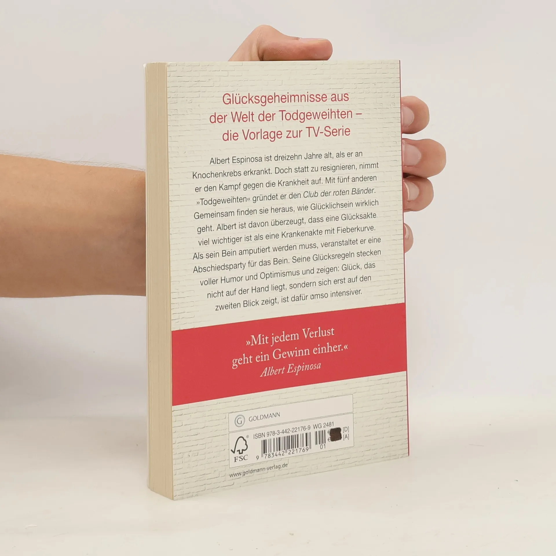 Der internationale Bestseller - die wahre Geschichte hinter der VOX-TV-Serie Albert Espinosa ist vierzehn Jahre alt, als er an Knochenkrebs erkrankt. Doch statt zu resignieren, nimmt er den Kampf gegen die Krankheit auf. Mit fünf anderen „Todgeweihten“ gründet er den Club der roten Bänder. Gemeinsam finden sie heraus, wie Glücklichsein wirklich geht. Albert ist davon überzeugt, dass eine Glücksakte viel wichtiger ist als eine Krankenakte mit Fieberkurve. Als sein Bein amputiert werden muss, veranstaltet er eine Abschiedsparty für das Bein. Seine Glücksregeln stecken voller Humor und Optimismus und zeigen: Glück, das nicht auf der Hand liegt, sondern sich erst auf den zweiten Blick zeigt, ist dafür umso intensiver. Diese Ausgabe ist inhaltlich identisch mit der Ausgabe Espinosa, Glücksgeheimnisse aus der gelben Welt.