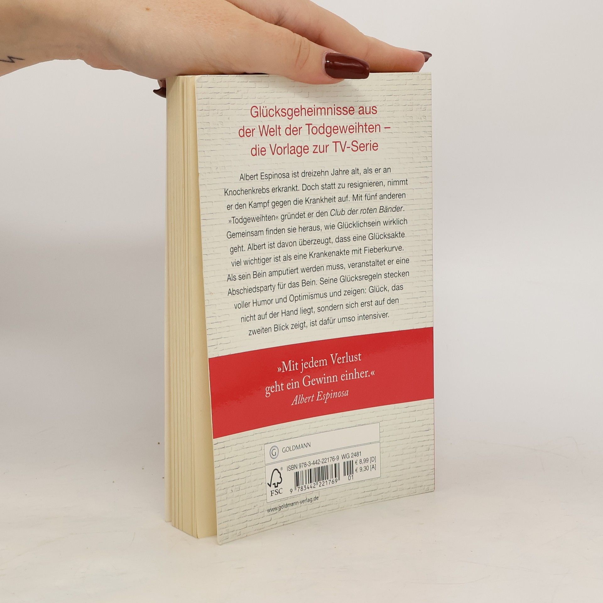 Der internationale Bestseller - die wahre Geschichte hinter der VOX-TV-Serie Albert Espinosa ist vierzehn Jahre alt, als er an Knochenkrebs erkrankt. Doch statt zu resignieren, nimmt er den Kampf gegen die Krankheit auf. Mit fünf anderen „Todgeweihten“ gründet er den Club der roten Bänder. Gemeinsam finden sie heraus, wie Glücklichsein wirklich geht. Albert ist davon überzeugt, dass eine Glücksakte viel wichtiger ist als eine Krankenakte mit Fieberkurve. Als sein Bein amputiert werden muss, veranstaltet er eine Abschiedsparty für das Bein. Seine Glücksregeln stecken voller Humor und Optimismus und zeigen: Glück, das nicht auf der Hand liegt, sondern sich erst auf den zweiten Blick zeigt, ist dafür umso intensiver. Diese Ausgabe ist inhaltlich identisch mit der Ausgabe Espinosa, Glücksgeheimnisse aus der gelben Welt.