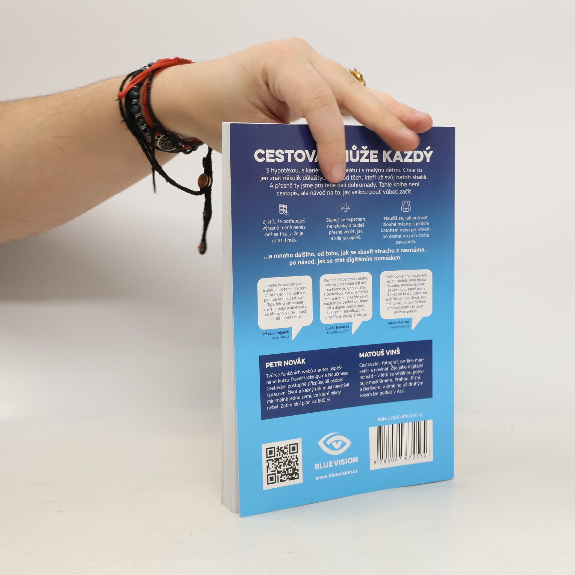 Cestovat může každý. S hypotékou, s kariérou v korporátu i s malými dětmi. Chce to jen znát pár důležitých triků od těch, kteří už svůj batoh sbalili. A přesně ty dali cestovatelé Matouš Vinš a Petr Novák v knize dohromady. Zdaleka přitom nečerpali jen z vlastních zkušeností, oslovili i mnoho ostřílených kolegů dobrodruhů a světoběžníků. Travel Bible je návod na to, jak velkou pouť vůbec začít a jak si ji naplno užít. Po jejím přečtení přestanete jen snít a skutečně vyrazíte do zemí, kam už se tak dlouho toužíte podívat. Zažijete věci, na které do konce života nezapomenete, a poznáte místa, která neuvidíte ani v National Geographic. V knize zjistíte, jak si na cestu našetřit, jak sehnat levné letenky a jak neutratit zbytečně mnoho za ubytování. Cestovat se dá i chytře, zdaleka není potřeba šetřit za každou cenu. Uvědomíte si, že nejlepší způsob je co nejvíce splynout s místními obyvateli a přestat se chovat jako turista. V druhé části knihy vám autoři přiblíží možnosti dobrovolničení a práce na cestách, přidají své zkušenosti s digitálním nomádstvím a pomůžou vám se osvobodit z klasických pracovních stereotypů. Závěr knihy věnují možnostem, jak si díky zážitkům, fotkám a videím z cest vydělat na objevování dalších zemí.