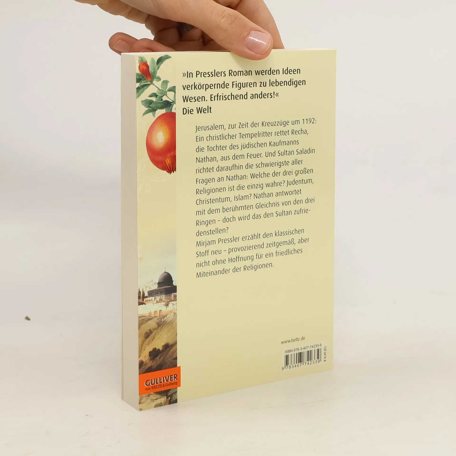 »Ein hochaktuelles, spannendes Buch über Toleranz und die Koexistenz der drei Religionen, die ja bis heute nicht gelingt.« Frankfurter Rundschau Jerusalem, zur Zeit der Kreuzzüge um 1192: Ein junger Tempelritter rettet Recha, die Tochter des jüdischen Kaufmanns Nathan, aus dem Feuer. Daraufhin richtet Sultan Saladin die schwierigste aller Fragen an Nathan: Welche Religion ist die einzig wahre? Nathan antwortet mit dem berühmten Gleichnis von den drei Ringen – doch wird das den Sultan zufriedenstellen? Außerdem ahnt Nathan nicht, dass ihm inzwischen der christliche Patriarch von Jerusalem und ein moslemischer Hauptmann nach dem Leben trachten ... Mirjam Pressler erzählt den klassischen Stoff neu – provozierend zeitgemäß, aber nicht ohne Hoffnung für ein friedliches Nebeneinander der Religionen.