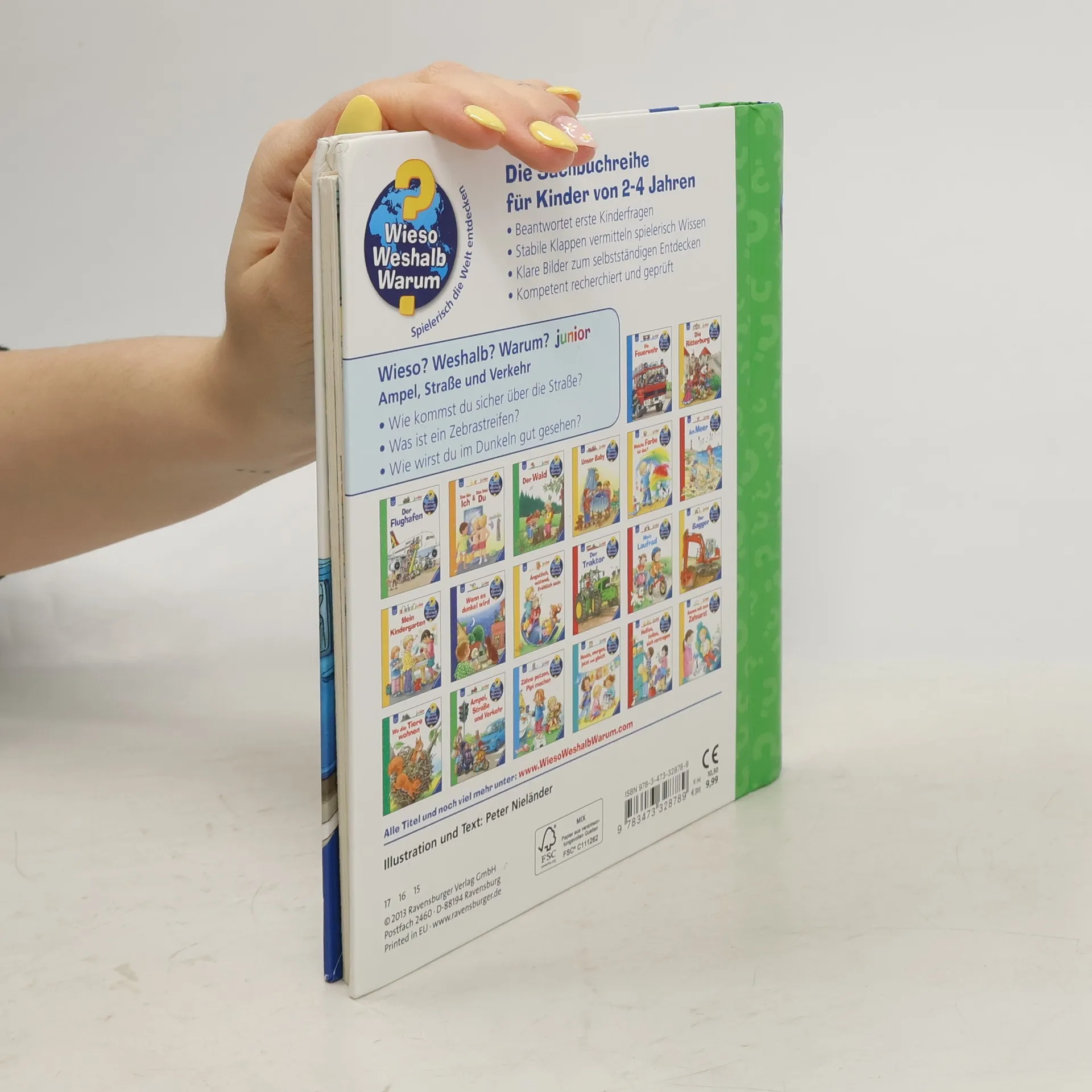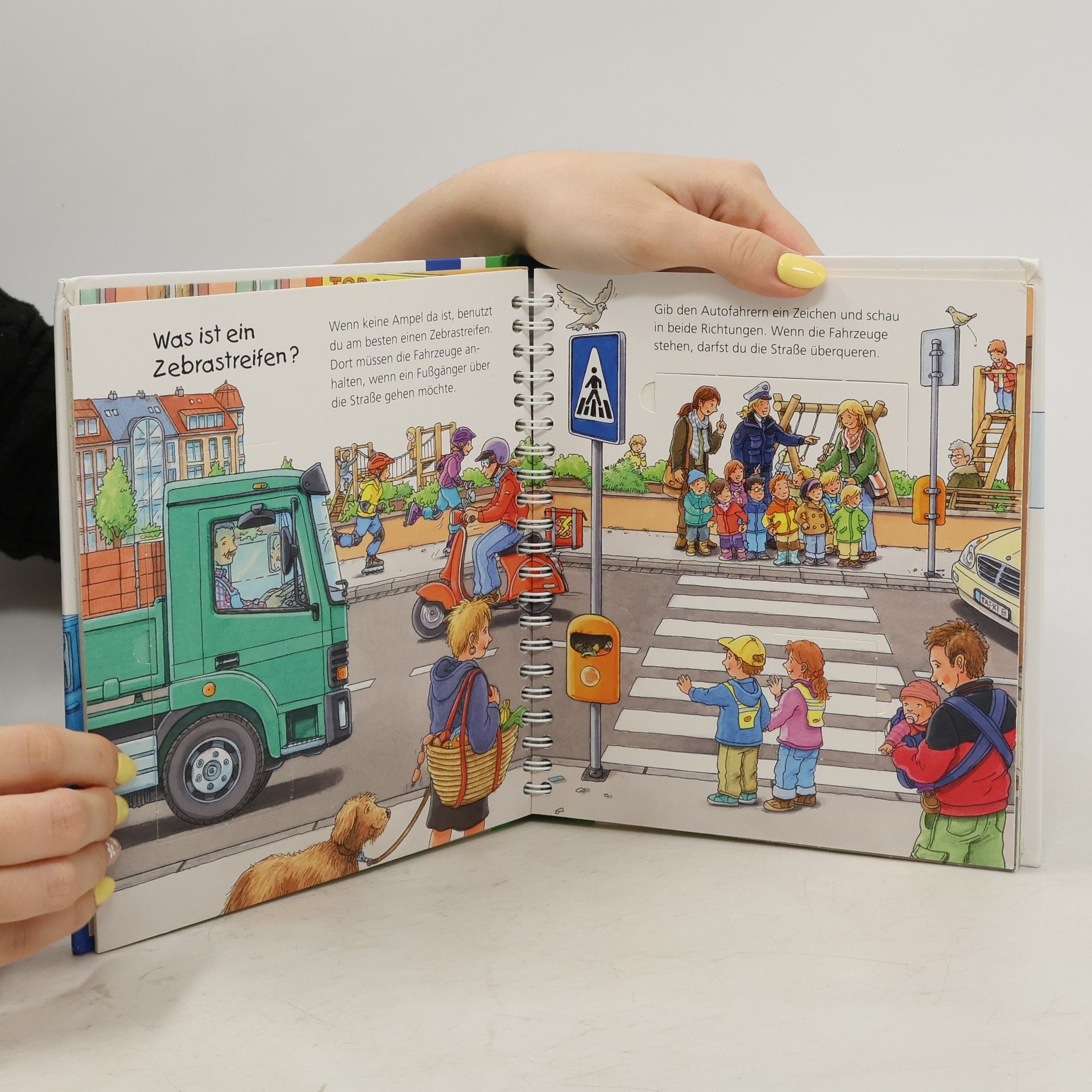 Wie überquert man eine Straße an einer Ampel oder einem Zebrastreifen? Wie wird man im Dunkeln gut gesehen? Kleine Kinder sind zwar noch nicht allein im Straßenverkehr unterwegs, trotzdem können sie in gefährliche Situationen geraten. Dieses Buch bringt ihnen anhand eindrücklicher Szenen und Bewegungsklappen die einfachsten Verhaltensregeln näher. Zum Abschluss können die Kinder in einem Richtig-Falsch-Quiz das Gelernte anwenden.