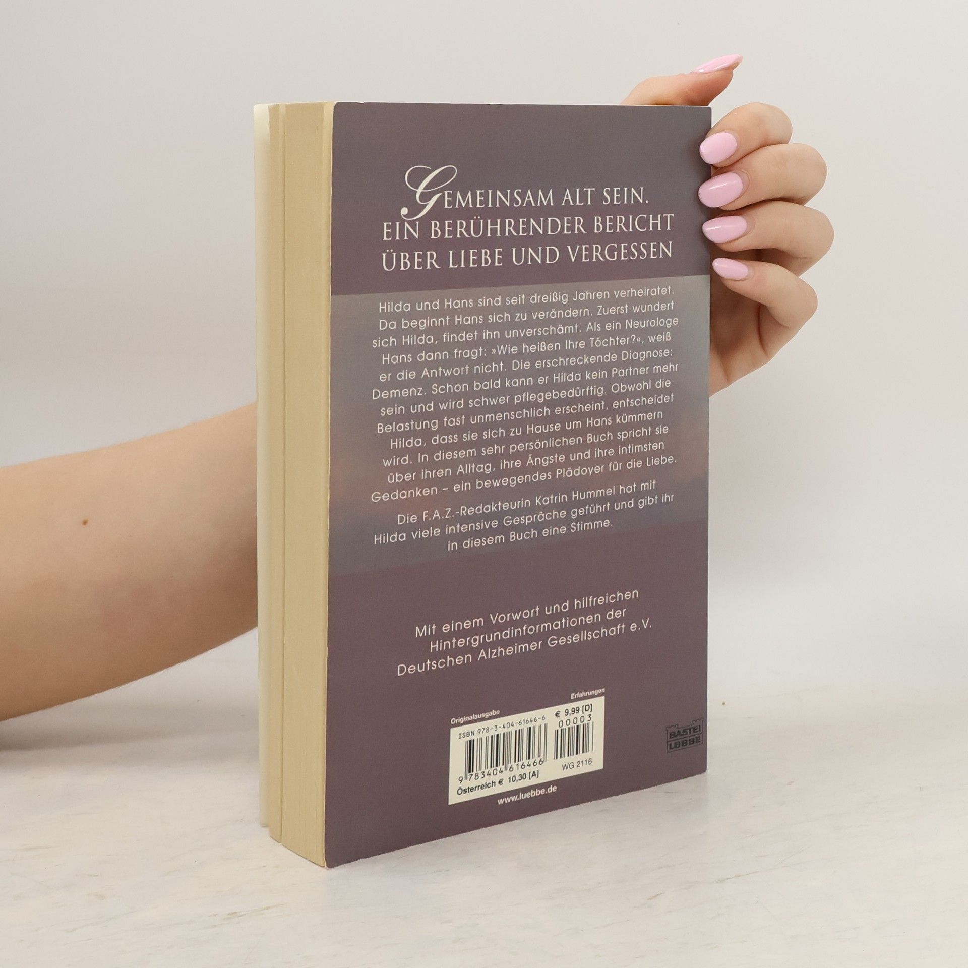 Hilda und Hans sind seit dreißig Jahren verheiratet. Doch langsam beginnt Hans sich zu verändern. Zuerst wundert sich Hilda über ihn, findet sein Verhalten manchmal unverschämt. Als ein Neurologe ihn dann fragt: „Wie heißen ihre Töchter?“, weiß Hans die Antwort nicht. Die erschreckende Diagnose: Demenz. Schon bald kann er seiner Frau Hilda kein Partner mehr sein und wird zum Schwerstpflegefall. Obwohl die Belastung fast unmenschlich erscheint, entscheidet Hilda, dass sie sich zu Hause um ihren Mann kümmern wird. In diesem sehr persönlichen Buch spricht sie über ihren Alltag, ihre Ängste und ihre intimsten Gedanken. Ihr Bericht ist ein bewegendes Plädoyer für die Liebe.