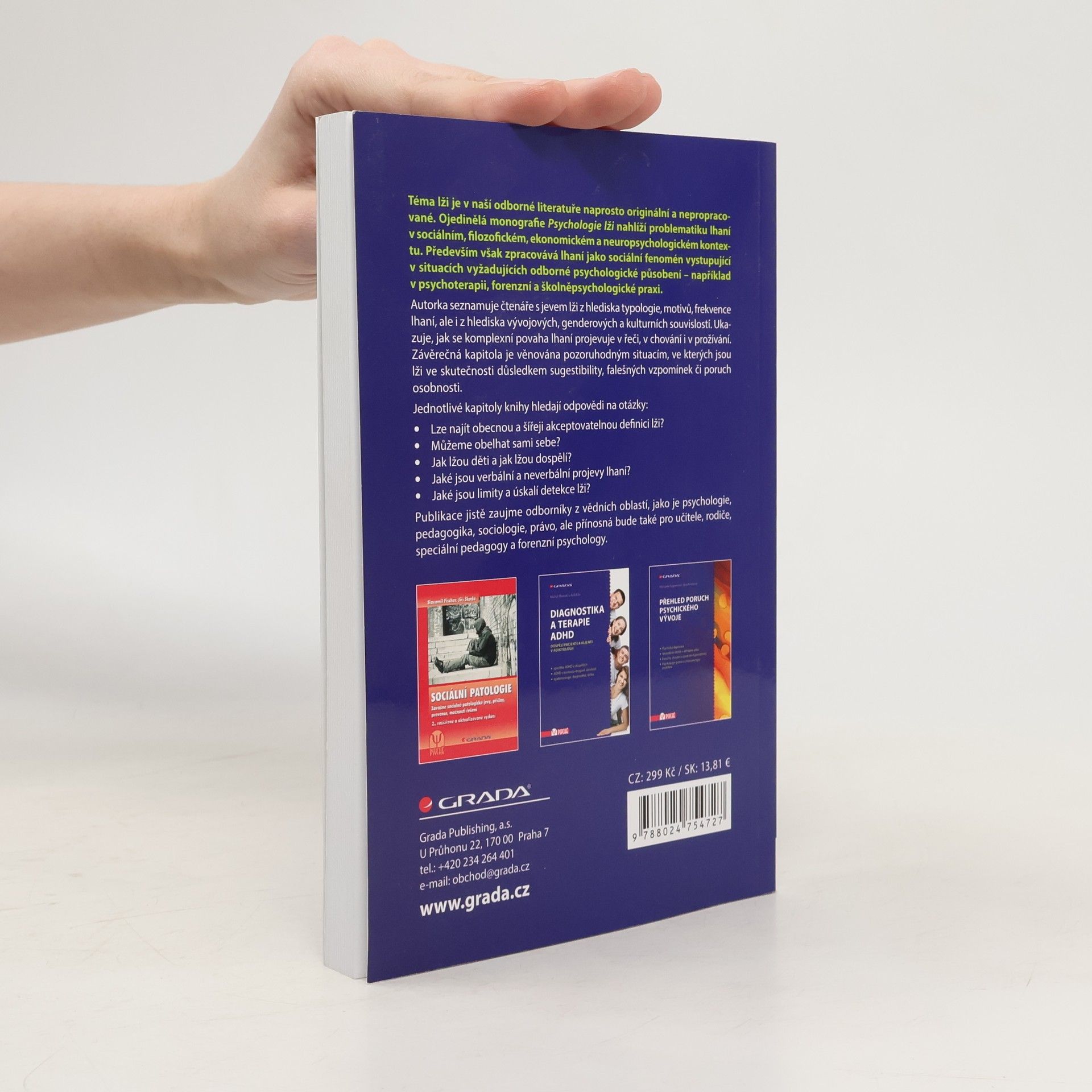 Lze najít obecnou a šířeji akceptovatelnou definici lži? Můžeme obelhat sami sebe? Jak lžou děti a jak lžou dospělí? Jaké jsou verbální a neverbální projevy lhaní? Jaké jsou limity a úskalí detekce lži? Na tyto a další otázky hledá odborně podložené odpovědi ojedinělá a komplexní monografie věnovaná fenoménu lži. Publikace nahlíží problematiku lhaní v sociálním, filozofickém, ekonomickém a neuropsychologickém kontextu. Především však zpracovává lhaní jako sociální fenomén vystupující v situacích vyžadujících odborné psychologické působení - například v psychoterapii, forenzní a školněpsychologické praxi. Autorka seznamuje čtenáře s jevem lži z hlediska typologie, motivů, frekvence lhaní, ale i z hlediska vývojových, genderových i kulturních souvislostí. Ukazuje, jak se komplexní povaha lhaní projevuje v řeči, v chování i v prožívání. Závěrečná kapitola je věnována pozoruhodným situacím, ve kterých jsou lži ve skutečnosti důsledkem sugestibility, falešných vzpomínek či poruch osobnosti. Monografie jistě zaujme odborníky z vědních oblastí, jako je psychologie, pedagogika, sociologie, právo, ale přínosná bude také pro učitele, rodiče, speciální pedagogy a forenzní psychology.