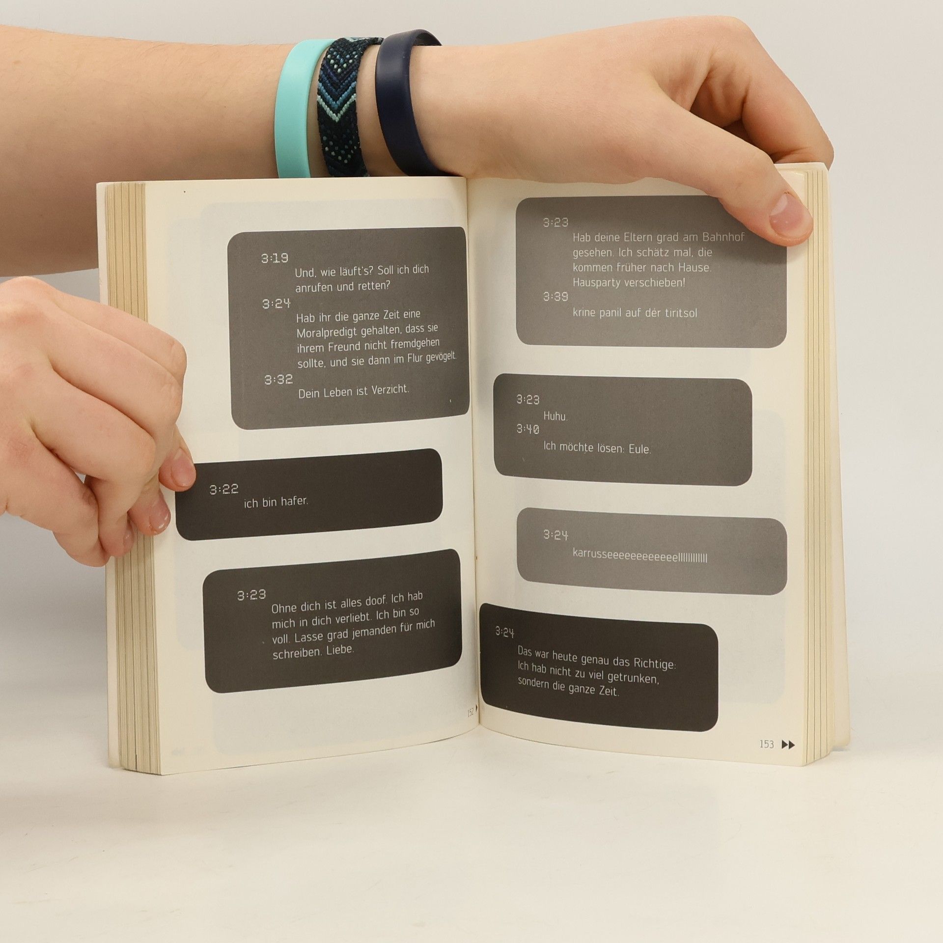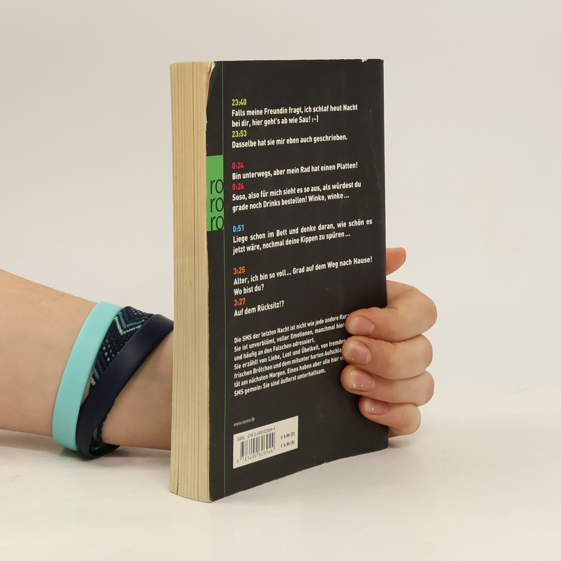 23:40Falls meine Freundin fragt, ich schlaf heut Nacht bei dir, hier gehts ab wie Sau! :-)23:53Dasselbe hat sie mir eben auch geschrieben.0:24Bin unterwegs, aber mein Rad hat einen Platten!0:26Soso, also für mich sieht es so aus, als würdest du grade noch Drinks bestellen! Winke, winke …0:51Liege schon im Bett und denke daran, wie schön es jetzt wäre, nochmal deine Kippen zu spüren …3:25Alter, ich bin so voll ... Grad auf dem Weg nach Hause! Wo bist du?3:27Auf dem Rücksitz!? Die SMS der letzten Nacht ist nicht wie jede andere Kurznachricht. Sie ist unverblümt, voller Emotionen, manchmal hieroglyphisch – und häufig an den Falschen adressiert.Sie erzählt von Liebe, Lust und Übelkeit, von fremden Betten und frischen Brötchen und dem mitunter harten Aufschlag in der Realität am nächsten Morgen. Eines haben aber alle hier versammelten SMS gemein: Sie sind äußerst unterhaltsam.
