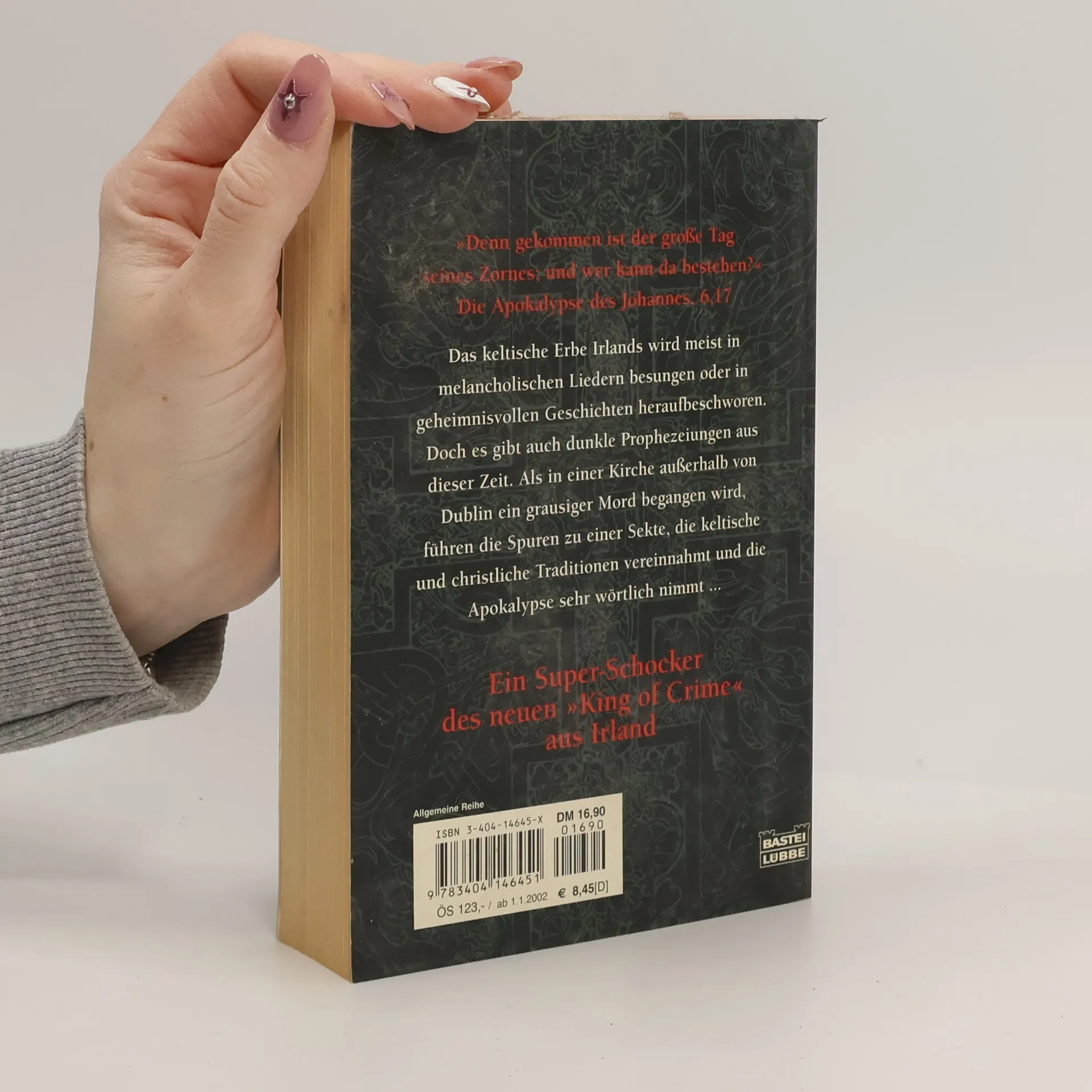 „Denn gekommen ist der große Tag seines Zornes; und wer kann da bestehen?“ Die Apokalypse des Johannes, 6, 17 Das keltische Erbe Irlands wird meist in melancholischen Liedern besungen oder in geheimnisvollen Geschichten heraufbeschworen. Doch es gibt auch dunkle Prophezeiungen aus dieser Zeit. Als in einer Kirche außerhalb von Dublin ein grausiger Mord begangen wird, führen die Spuren zu einer Sekte, die keltische und christliche Traditionen vereinnahmt und die Apokalypse sehr wörtlich nimmt ... Ein Super-Schocker des neuen „King of Crime“ aus Irland.