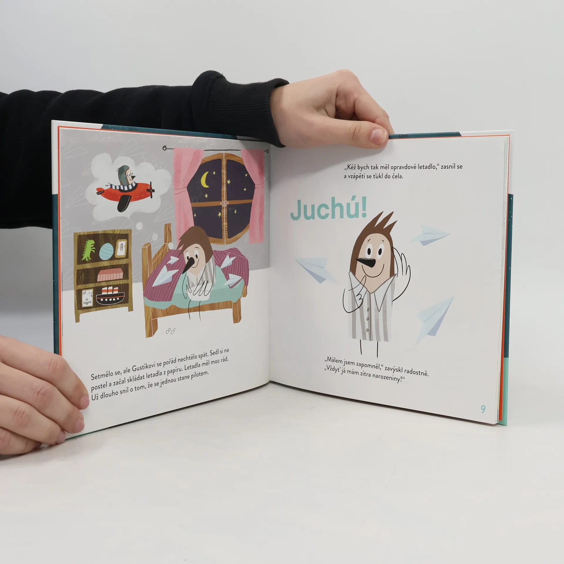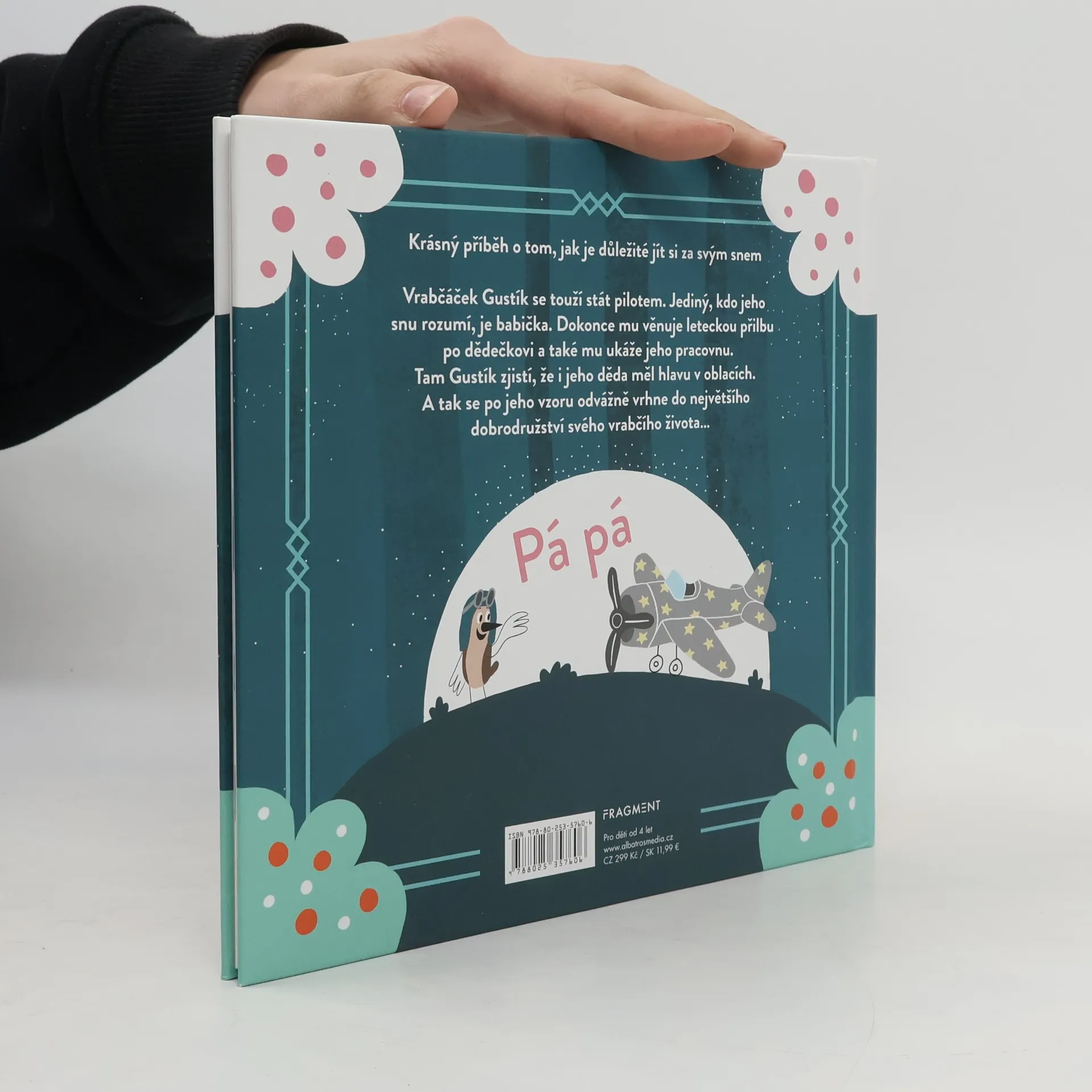 Krásný příběh o vytrvalosti, odvaze a také o tom, jak je důležité jít si za svým snem. Vrabčáček Gustík se touží stát pilotem. Jediný, kdo mu rozumí, je jeho babička. Dokonce mu věnuje leteckou přilbu po dědečkovi a také mu ukáže jeho pracovnu. Tam Gustík zjistí, že i jeho děda měl hlavu v oblacích…
