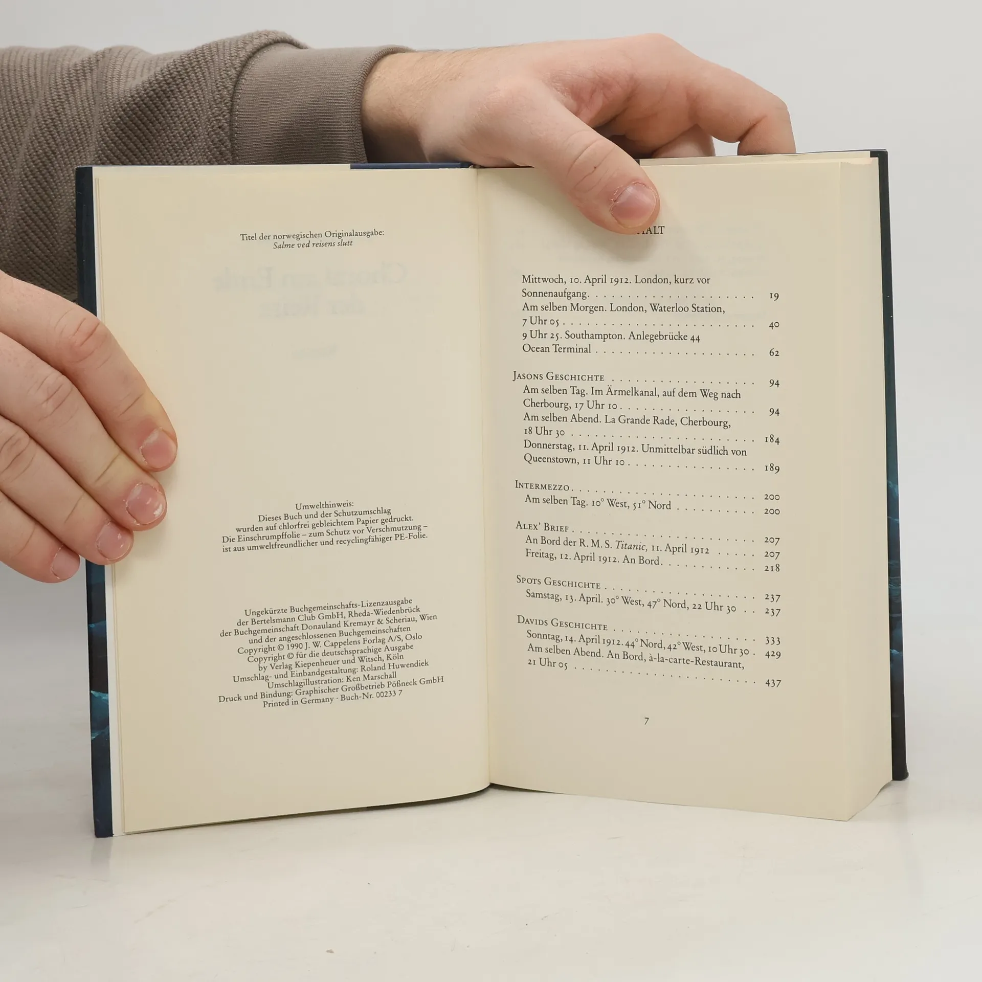 Die Titanic war das größte und modernste Passagierschiff ihrer Zeit, und ihre Jungfernfahrt in den Untergang hat die Schriftsteller unseres Jahrhunderts immer wieder beschäftigt. So sehr, daß ihr Name zur Metapher für die apokalyptischen Visionen und Untergangsstimmungen des 20. Jahrhunderts wurde. Die Geschichte beginnt am 10. April 1912. An diesem Tag gehen im englischen Southhampton sieben Musiker an Bord des Luxusliners, der auf seiner fünftägigen Jungfernfahrt mehr als zweitausend Menschen nach New York bringen soll. Die Musiker, eine bunt zusammengewürfelte Truppe aus aller Herren Länder, sind für die musikalische Unterhaltung während der Seereise zuständig. In den fünf Tagen, die ihnen noch an Bord verbleiben, lernt man ihre höchst unterschiedlichen Lebensgeschichten kennen - Biografien voller Hoffnungen und Niederlagen, voller Leidenschaften und Verzweiflung.
