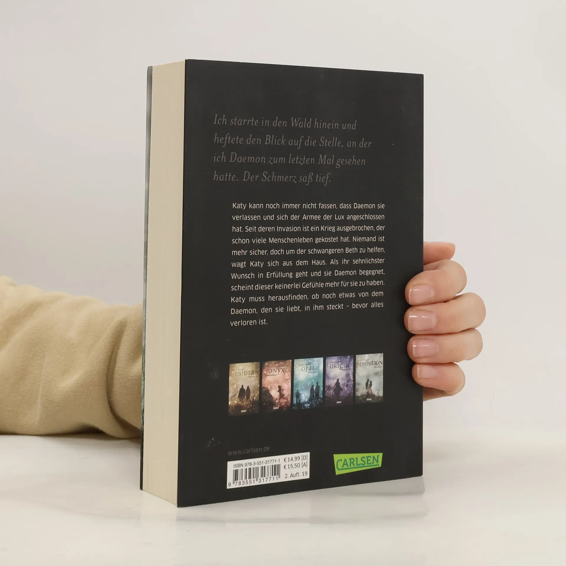 Katy kann noch immer nicht glauben, dass Daemon sie verlassen und sich der Armee der Lux angeschlossen hat. Seit deren Invasion ist ein Krieg ausgebrochen, der schon viele Menschenleben gekostet hat. Niemand ist mehr sicher, doch um der schwangeren Beth zu helfen, wagt Katy sich aus dem Haus. Als ihr größter Wunsch in Erfüllung geht und sie Daemon begegnet, scheint dieser jegliche Gefühle für sie verloren zu haben. Katy muss herausfinden, ob noch etwas von dem Daemon, den sie liebt, in ihm steckt – bevor alles verloren ist. Der SPIEGEL-Bestseller und letzte Band der Obsidian-Serie endlich im Taschenbuch! Alle Bände der unwiderstehlichen Bestsellerserie: Obsidian. Schattendunkel Onyx. Schattenschimmer Opal. Schattenglanz Origin. Schattenfunke Opposition. Schattenblitz Die Obsidian-Serie ist abgeschlossen. Alle Bände der dazugehörigen Oblivion-Serie: Oblivion 1: Lichtflüstern (Obsidian aus Daemons Sicht erzählt) Oblivion 2: Lichtflimmern (Onyx aus Daemons Sicht erzählt) Oblivion 3: Lichtflackern (Opal aus Daemons Sicht erzählt) Wow: Am 30.11.2018 erscheint »Revenge. Sternensturm«, der erste Band einer neuen Spin-off-Serie!