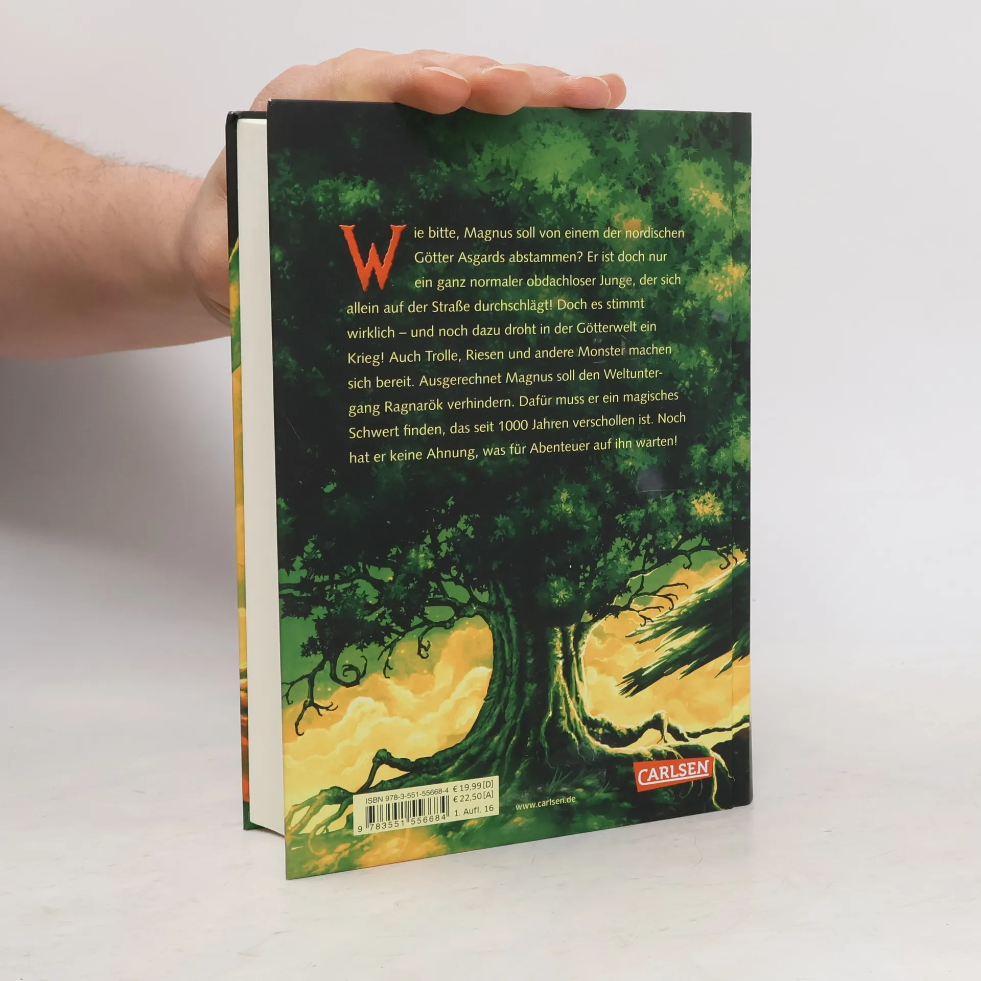 Nach dem Tod seiner Mutter lebt Magnus allein auf der Straße, ohne seinen Vater zu kennen. Als sein Onkel ihn findet, erfährt er, dass er von einem der nordischen Götter Asgards abstammt. Doch die Götter rüsten sich für den Krieg, während Trolle, Riesen und andere Monster sich ebenfalls vorbereiten. Magnus wird auserwählt, Ragnarök, den Weltuntergang, zu verhindern. Um dies zu erreichen, muss er ein seit 1000 Jahren verschwundenes magisches Schwert finden. Seine Reise erfordert zahlreiche Abenteuer, Kämpfe gegen gefährliche Kreaturen und Verhandlungen mit Göttern und Riesen. Zudem muss er seine göttlichen Fähigkeiten trainieren und lernen, Freundschaften zu schließen. In dieser Fantasy-Trilogie bringt der Autor alte Sagen und Legenden in moderne Geschichten und begeistert Leser*innen weltweit für die nordische Mythologie. Die Geschichte ist geprägt von Humor, Heldenmut und fantastischen Elementen, die sowohl junge Leser ab 12 Jahren als auch Fans der nordischen Mythologie fesseln. Feuerriesen, Walküren und Götter machen diese Erzählung zu einem packenden Erlebnis.