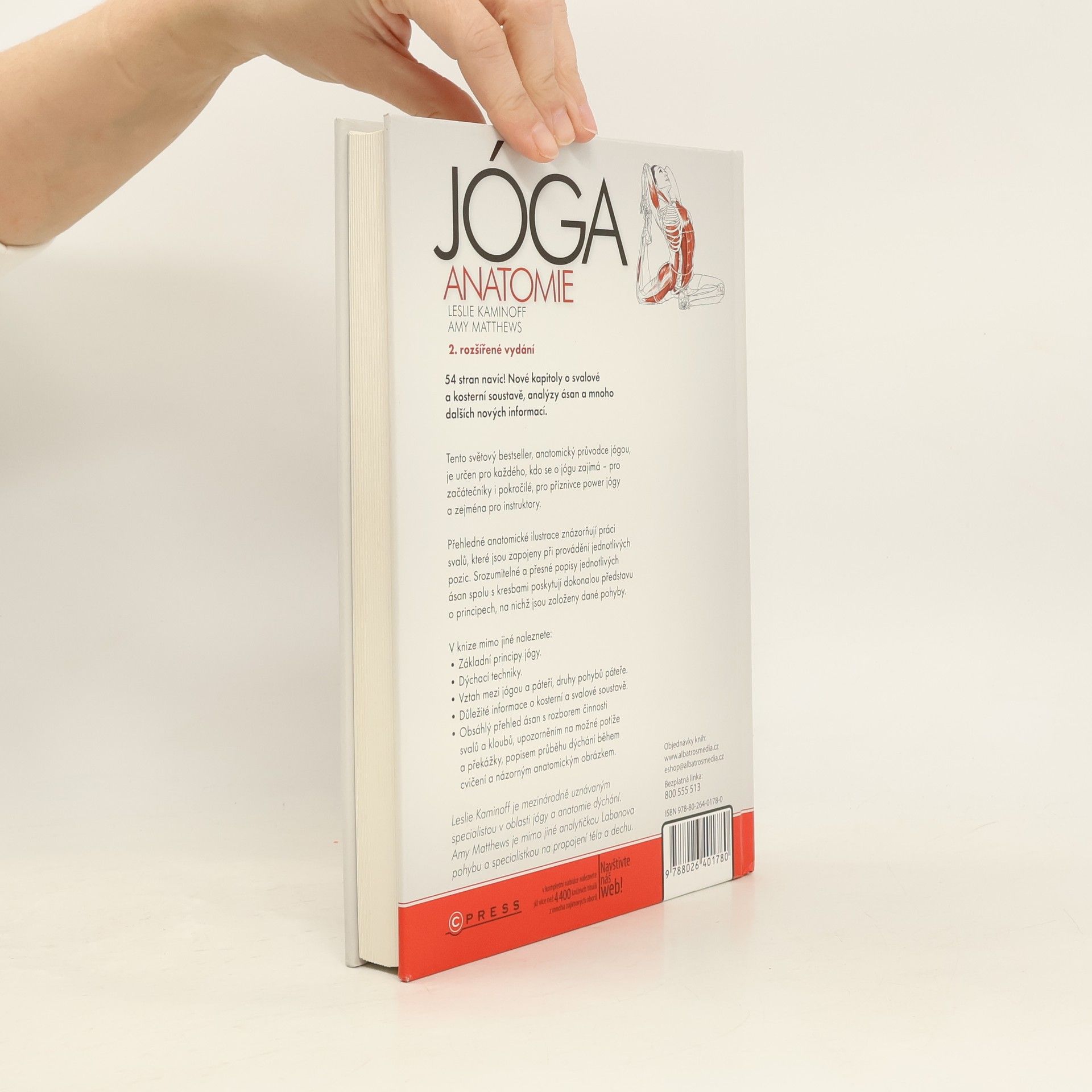 Názorná ilustrovaná publikace určená jak zájemcům o cvičení jógy, tak instruktorům a lektorům. Laické veřejnosti přiblíží význam jógy a její blahodárné působení na svalové skupiny, instruktorům pomůže v jejich práci: kniha představuje jednotlivé pozice - asány - a jejich vliv na svaly, zapojené při provádění daných cviků, s přesnými popisy svalů přímo v ilustraci a srozumitelným slovním vysvětlením. Tento světový bestseller, anatomický průvodce jógou, je určen pro každého, kdo se o jógu zajímá pro začátečníky i pokročilé, pro příznivce power jógy a zejména pro instruktory. Přehledné anatomické ilustrace znázorňují práci svalů, které jsou zapojeny při provádění jednotlivých pozic. Srozumitelné a přesné popisy jednotlivých ásan spolu s kresbami poskytují dokonalou představu o principech, na nichž jsou založeny dané pohyby. V knize mimo jiné naleznete: Základní principy jógy. Dýchací techniky. Vztah mezi jógou a páteří, druhy pohybů páteře. Obsáhlý přehled ásan s rozborem činnosti svalů a kloubů, upozorněním na možné potíže a překážky, popisem průběhu dýchání během cvičení a názorným anatomickým obrázkem. Autor Leslie Kaminoff je mezinárodně uznávaným specialistou v oblasti jógy a anatomie dýchání. Bydlí v USA a pracuje v New Yorku.