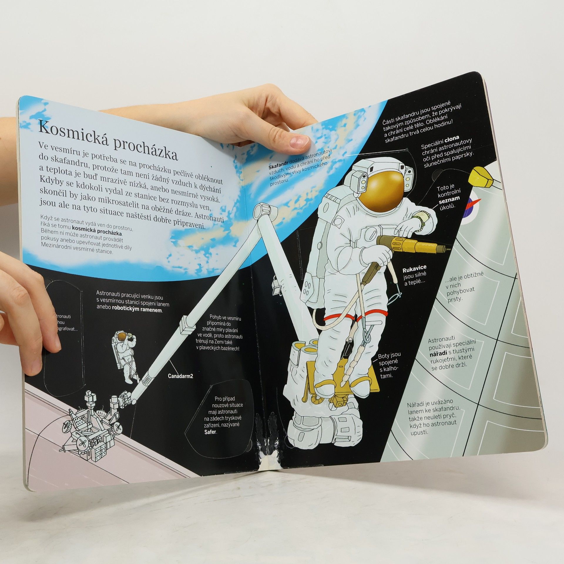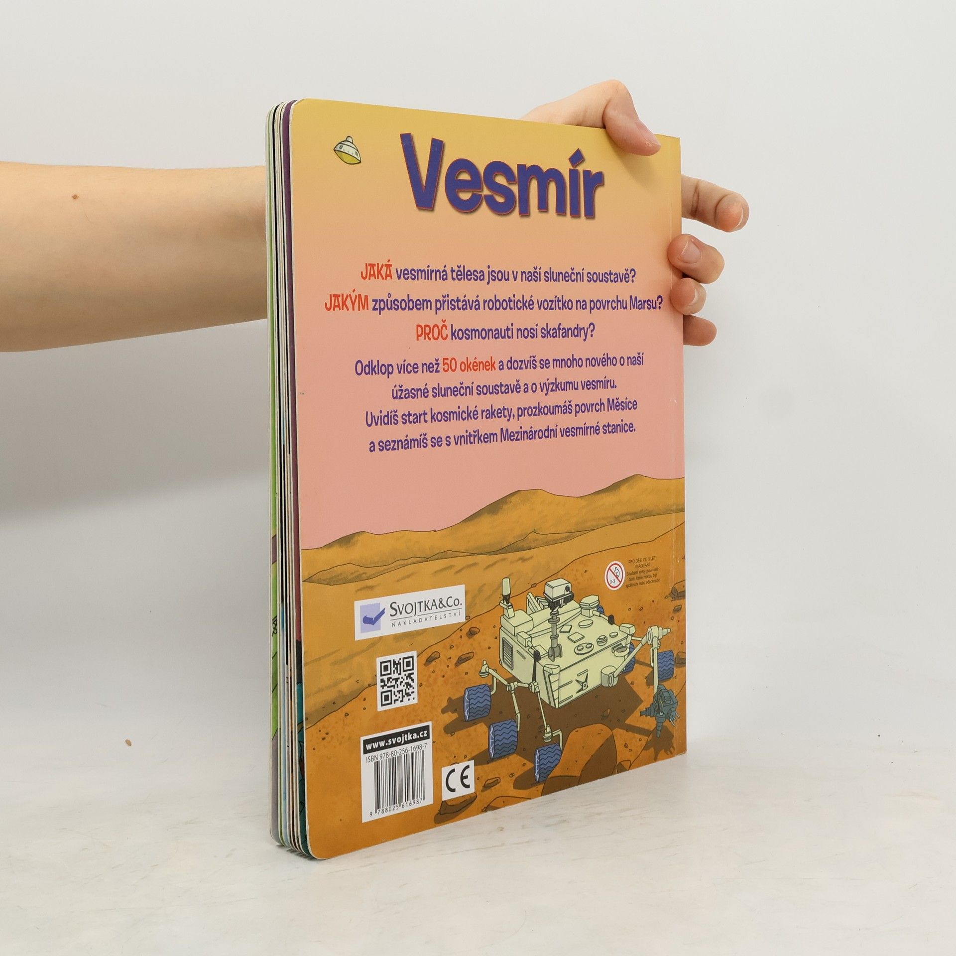 Jaká vesmírná tělesa jsou v naší sluneční soustavě? Jakým způsobem přistává robotické vozítko na povrchu Marsu? Proč nosí kosmonauti skafandry? Otevři postupně všech 50 okének v této knížce a dozvíš se mnoho nového o naší sluneční soustavě a o výzkumu vesmíru. Uvidíš start kosmické rakety, prozkoumáš povrch Měsíce a seznámíš se s vnitřkem mezinárodní vesmírné stanice. Tak do toho, objev nepoznané a zjisti něco nového o vesmíru!