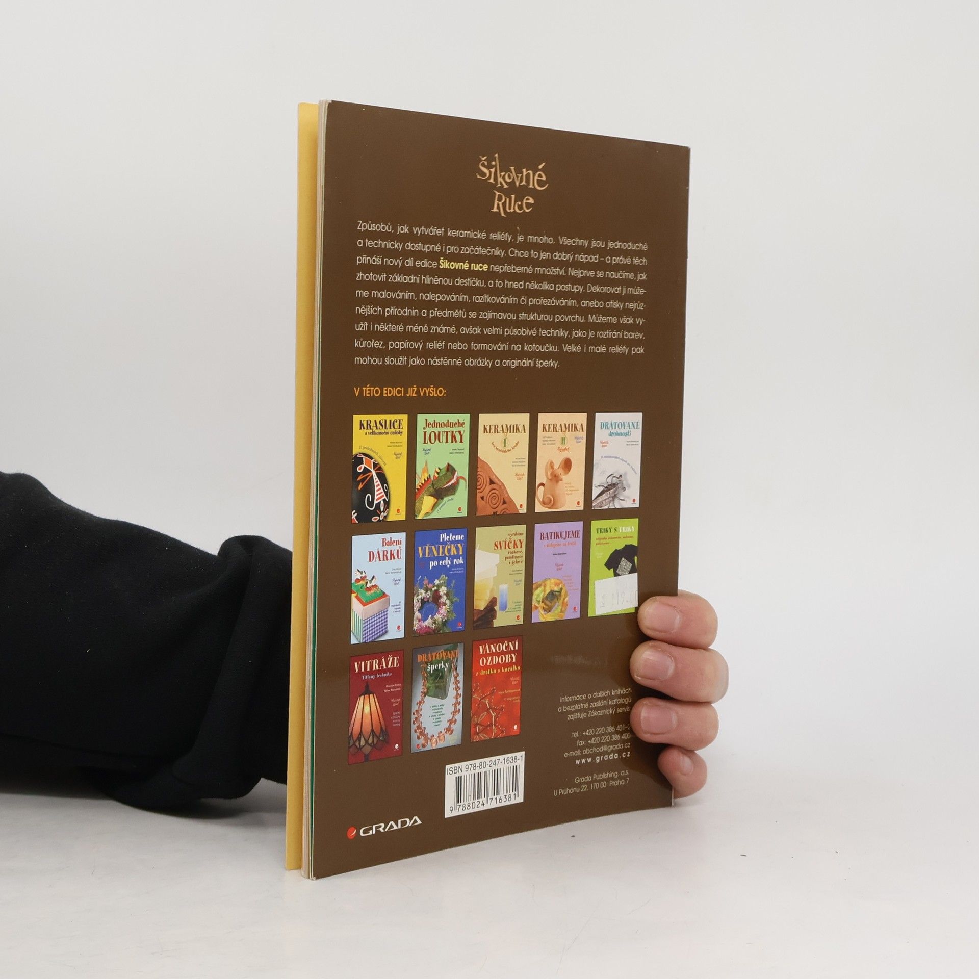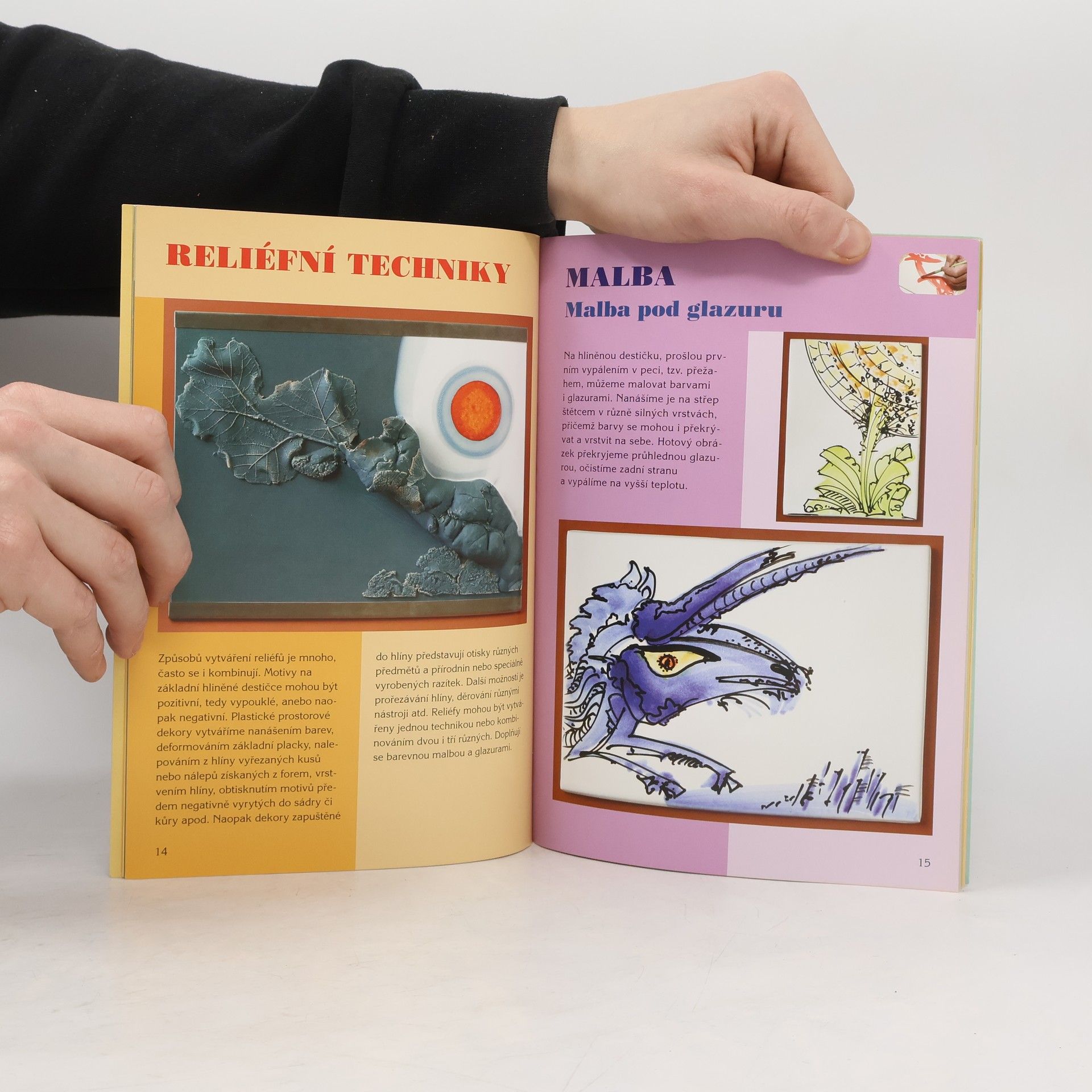 Způsobů, jak vytvářet keramické reliéfy, je mnoho. Všechny jsou jednoduché a technicky dostupné i pro začátečníky. Chce to jen dobrý nápad - a právě těch přináší nový díl edice Šikovné ruce nepřeberné množství. Nejprve se naučíme, jak zhotovit základní hliněnou destičku, a to hned několika postupy. Dekorovat ji můžeme malováním, nalepováním, razítkováním či prořezáváním, anebo otisky nejrůznějších přírodnin a předmětů se zajímavou strukturou povrchu. Můžeme však využít i některé méně známé, avšak velmi působivé techniky, jako je roztírání barev, kůrořez, papírový reliéf nebo formování na kotoučku. Velké i malé reliéfy pak mohou sloužit jako nástěnné obrázky a originální šperky. Originální návodová knížka je určena pro děti i rodiče, vedoucí keramických kroužků, kurzů i učitele výtvarné výchovy.
