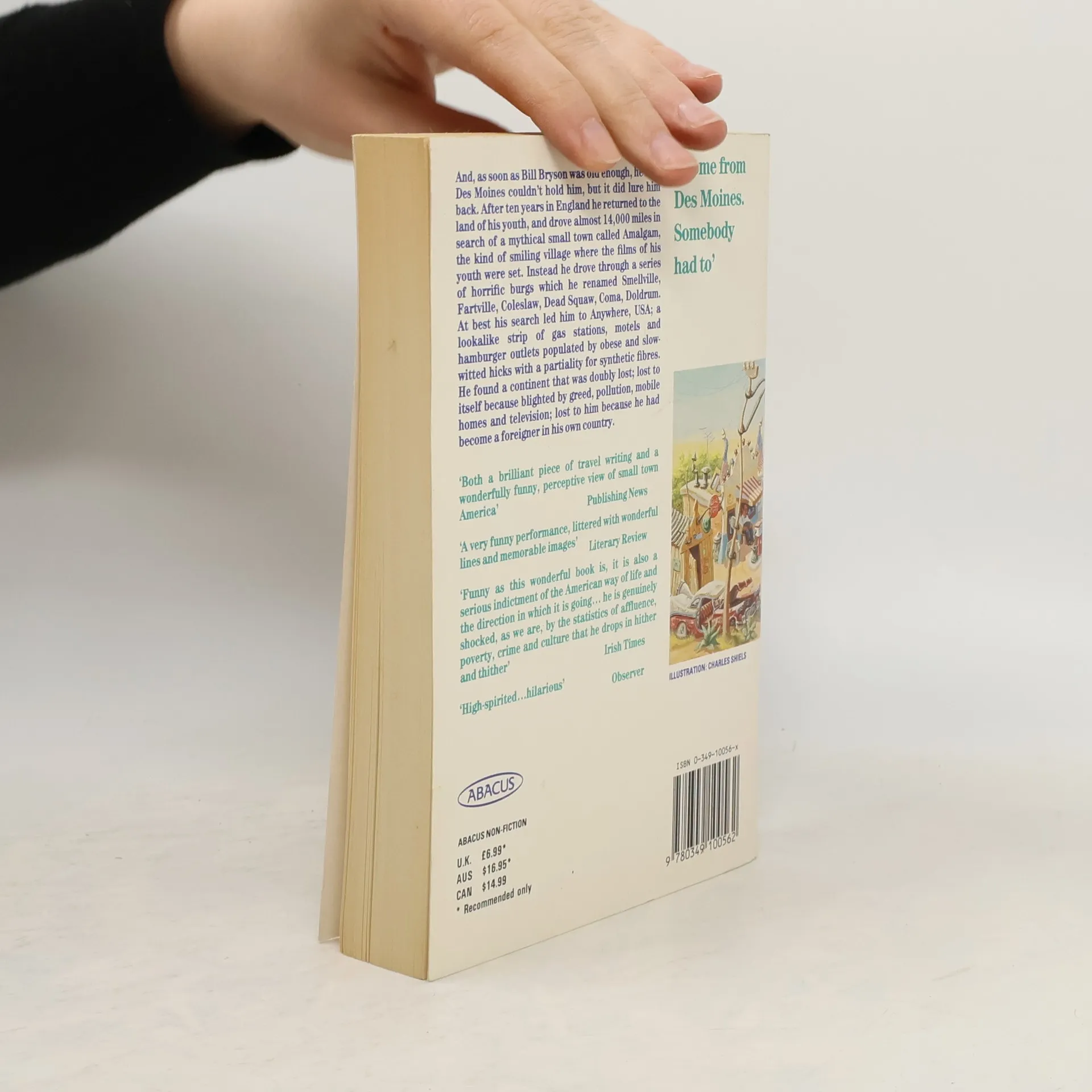 Bill Bryson drove 14,000 miles in search of the mythical small town of his youth. Instead he found a lookalike strip of gas stations, motels and hamburger joints; a continent lost to itself through greed, pollution and television, and lost to him because he had become a foreigner in his own country. A funny and serious view of smalltown America.
