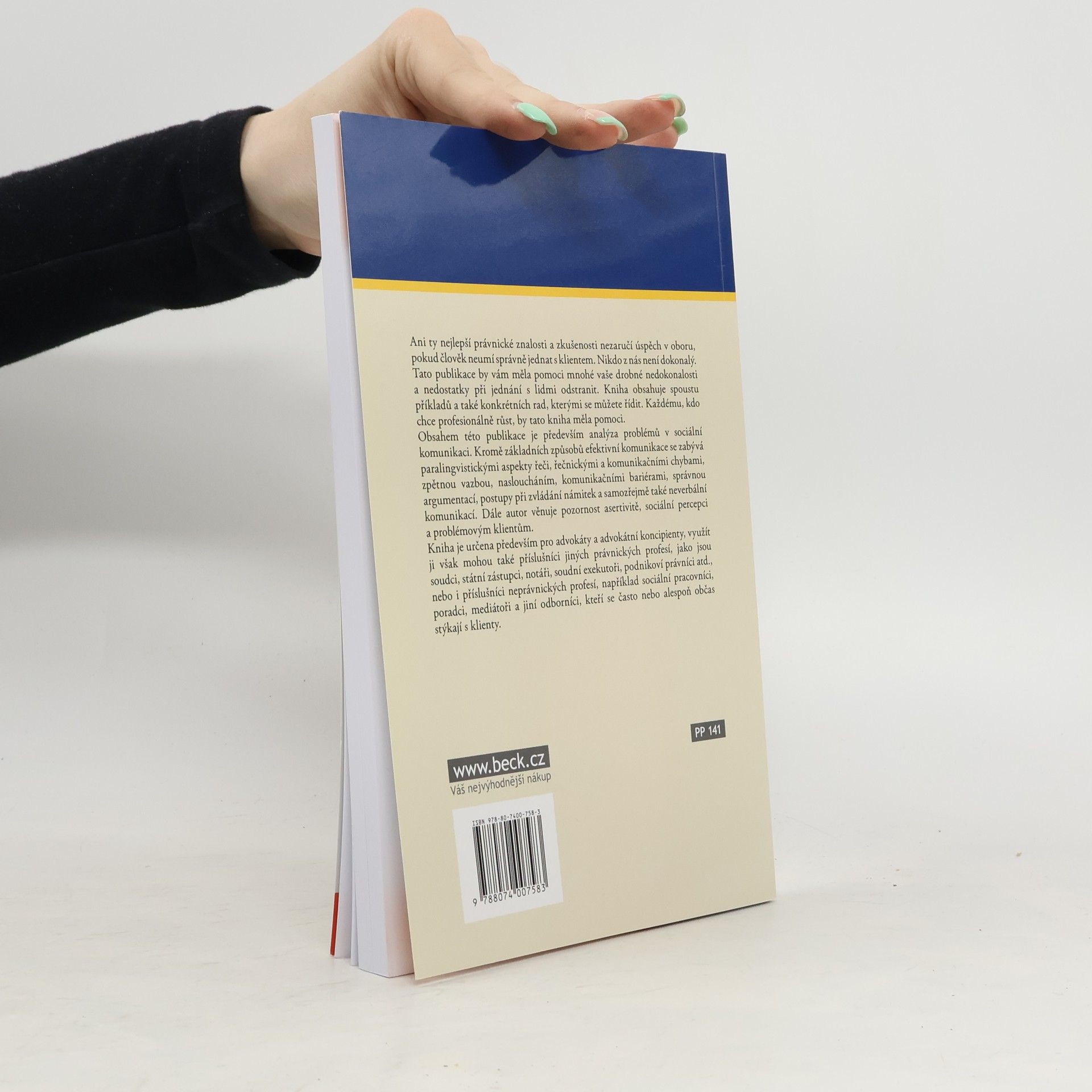 Ani ty nejlepší právnické znalosti a zkušenosti nezaručí úspěch v oboru, pokud člověk neumí správně jednat s klientem. Nikdo z nás není dokonalý. Tato publikace by vám měla pomoci mnohé vaše drobné nedokonalosti a nedostatky při jednání s lidmi odstranit. Kniha obsahuje spoustu příkladů a také konkrétních rad, kterými se můžete řídit. Každému, kdo chce profesionálně růst, by tato kniha měla pomoci.Obsahem této publikace je především analýza problémů v sociální komunikaci. Kromě základních způsobů efektivní komunikace se zabývá paralingvistickými aspekty řeči, řečnickými a komunikačními chybami, zpětnou vazbou, nasloucháním, komunikačními bariérami, správnou argumentací, postupy při zvládání námitek a samozřejmě také neverbální komunikací. Dále autor věnuje pozornost asertivitě, sociální percepci a problémovým klientům.Kniha je určena především pro advokáty a advokátní koncipienty, využít ji však mohou také příslušníci jiných právnických profesí, jako jsou soudci, státní zástupci, notáři, soudní exekutoři, podnikoví právníci atd., nebo i příslušníci neprávnických profesí, například sociální pracovníci, poradci, mediátoři a jiní odborníci, kteří se často nebo alespoň občas stýkají s klienty.