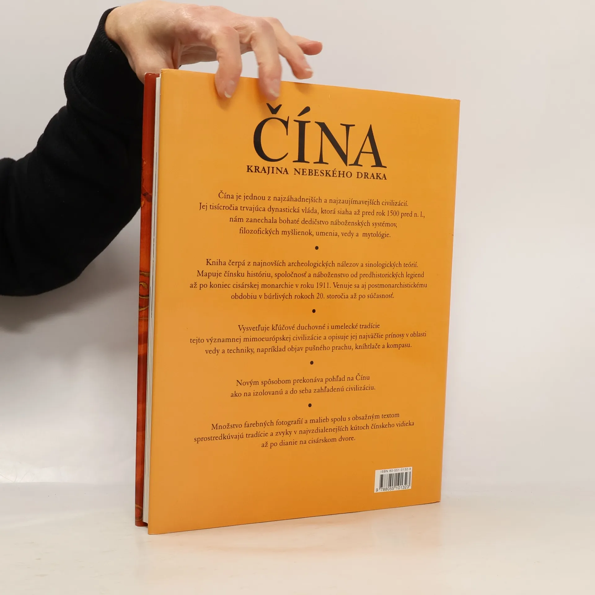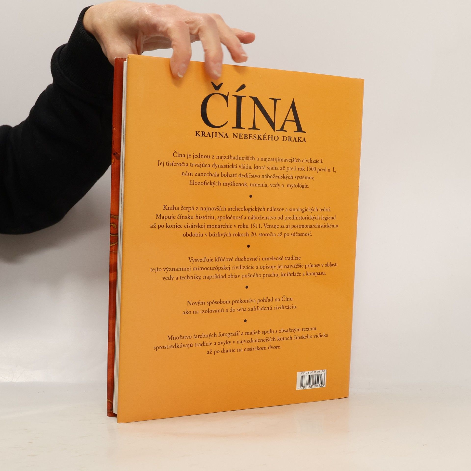 Čína je jednou z najzáhadnejších a najzaujímavejších civilizácií. Jej tisícročia trvajúca dynastická vláda, ktorá siaha až pred rok 1500 pred n. l., nám zanechala bohaté dedičstvo náboženských systémov, filozofických myšlienok, umenia, vedy a mytológie. Kniha čerpá z najnovších archeologických nálezov a sinologických teórií. Mapuje čínsku históriu, spoločnosť a náboženstvo od predhistorických legiend až po koniec cisárskej monarchie v roku 1911. Venuje sa aj postmonarchickému obdobiu v búrlivých rokoch 20. storočia až po súčasnosť. Vysvetľuje kľúčové duchovné a umelecké tradície tejto významnej mimoeurópskej civilizácie a opisuje jej najväčšie prínosy v oblasti vedy a techniky, napríklad objav pušného prachu, kníhtlače a kompasu. Novým spôsobom prekonáva pohľad na Čínu ako izolovanú a do seba zahľadenú civilizáciu. Množstvo farebných fotografií a malieb spolu s obsažným textom sprostredkúvajú tradície a zvyky v najvzdialenejších kútoch čínskeho vidieka až po dianie na cisárskom dvore.