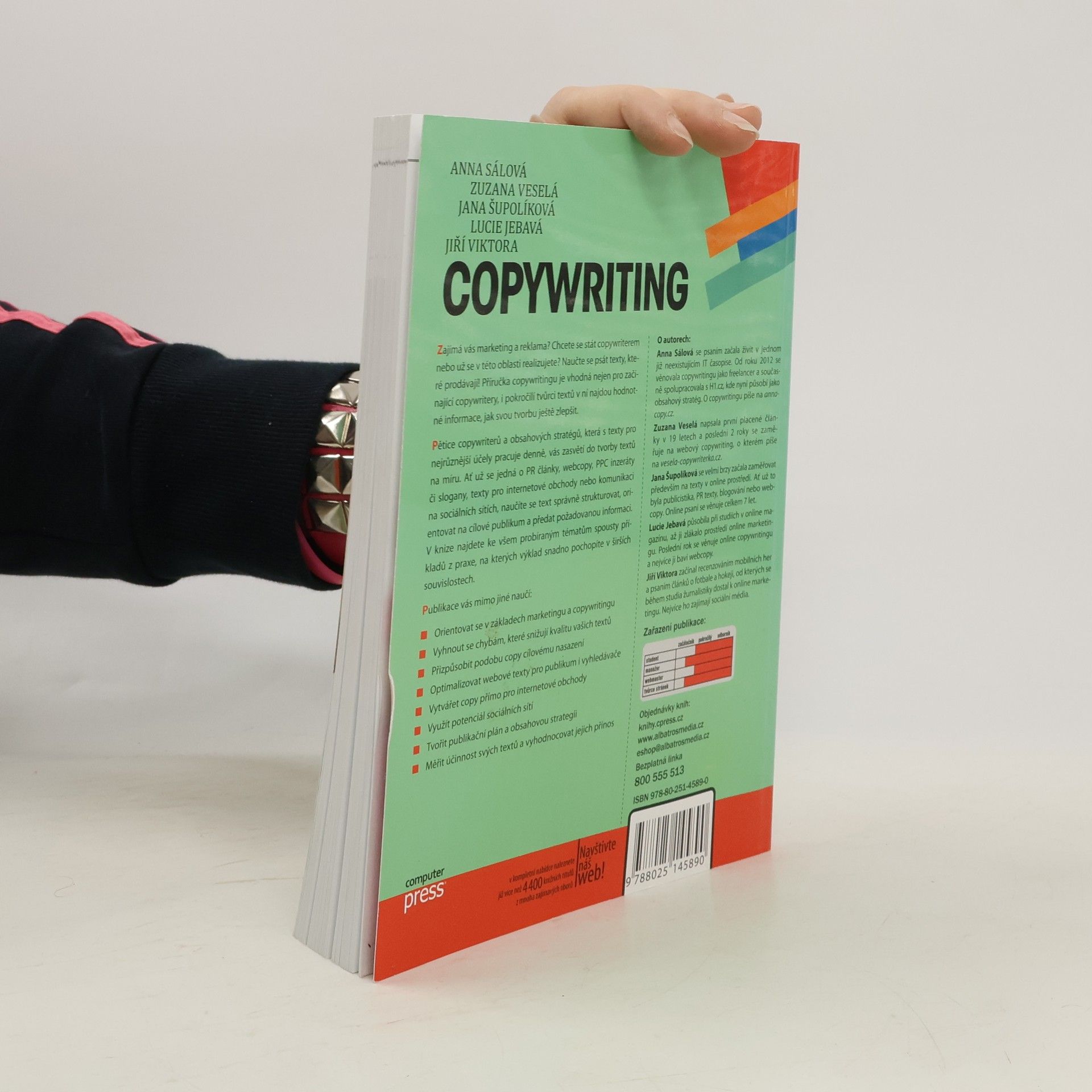 Zajímá vás marketing a reklama? Chcete se stát copywriterem, nebo už se v této oblasti realizujete? Naučte se psát texty, které prodávají! Příručka copywritingu je vhodná nejen pro začínající copywritery, i pokročilí tvůrci textů v ní najdou hodnotné informace, jak svou tvorbu ještě zlepšit. Pětice copywriterů a obsahových stratégů, která s texty pro nejrůznější účely pracuje denně, vás zasvětí do tvorby textů na míru. Ať už se jedná o PR články, webcopy, PPC inzeráty či slogany, texty na internetové obchody nebo komunikaci na sociálních sítích, naučíte se text správně strukturovat, orientovat na cílové publikum a předat požadovanou informaci. V knize najdete ke všem probíraným tématům spousty příkladů z praxe, na kterých výklad snadno pochopíte v širších souvislostech. Publikace vás mimo jiné naučí: - Orientovat se v základech marketingu a copywritingu - Vyhnout se chybám, které snižují kvalitu vašich textů - Přizpůsobit podobu copy cílovému nasazení - Optimalizovat webové texty pro cílové publikum i vyhledávače - Vytvářet copy přímo pro internetové obchody - Využít potenciál sociálních sítí - Tvořit publikační plán a obsahovou strategii - Měřit účinnost svých textů a vyhodnocovat jejich přínos