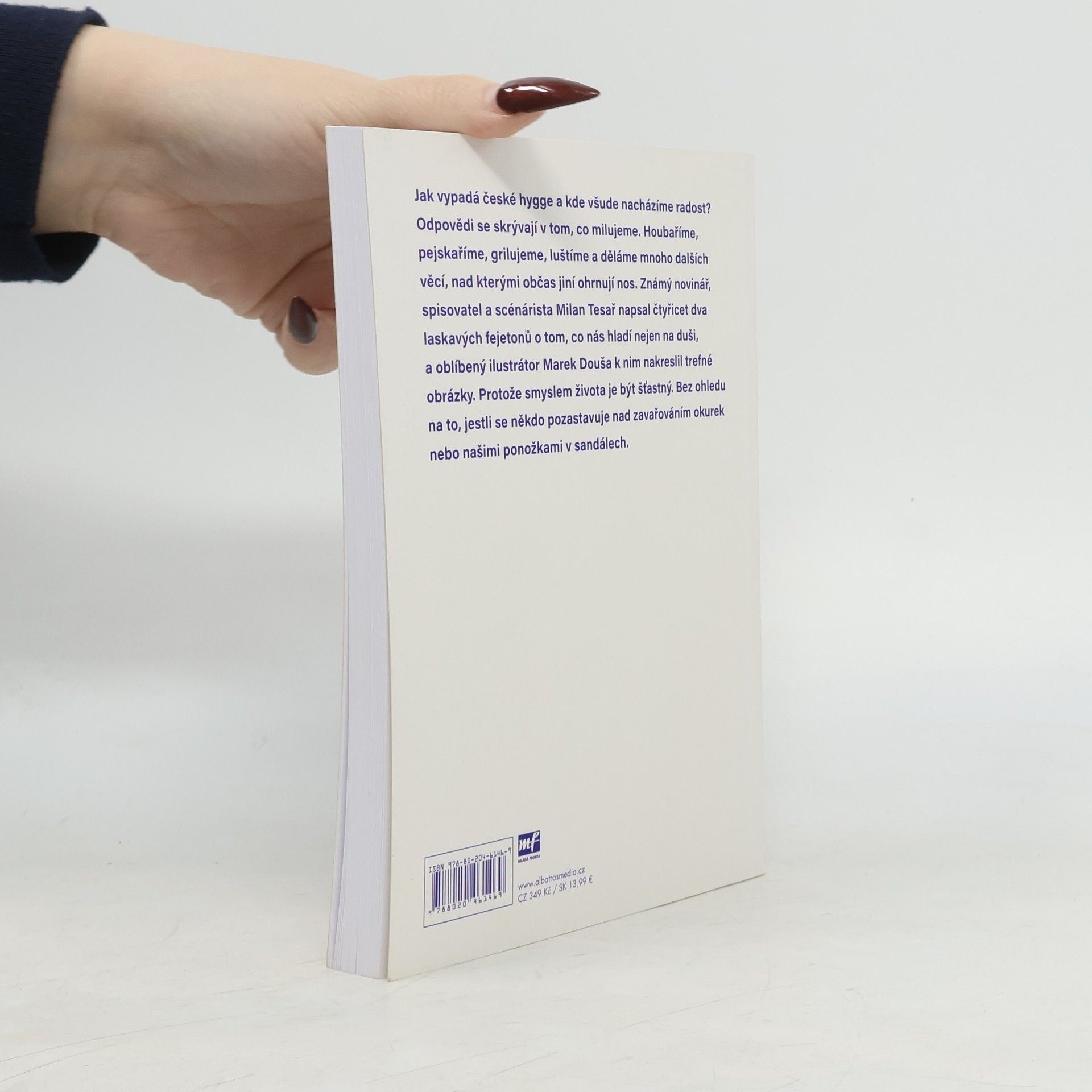 Jak vypadá české hygge a kde všude nacházíme radost? Odpovědi se skrývají v tom, co milujeme. Houbaříme, pejskaříme, grilujeme, luštíme a děláme mnoho dalších věcí, nad kterými občas jiní ohrnují nos. Známý novinář Milan Tesař napsal čtyřicet dva láskavých fejetonů o tom, co nás hladí nejen na duši, a oblíbený ilustrátor Marek Douša k nim nakreslil trefné obrázky. Protože smyslem života je být šťastný. Bez ohledu na to, jestli někdo ohrnuje nos nad zavařováním okurek nebo našimi ponožkami v sandálech.