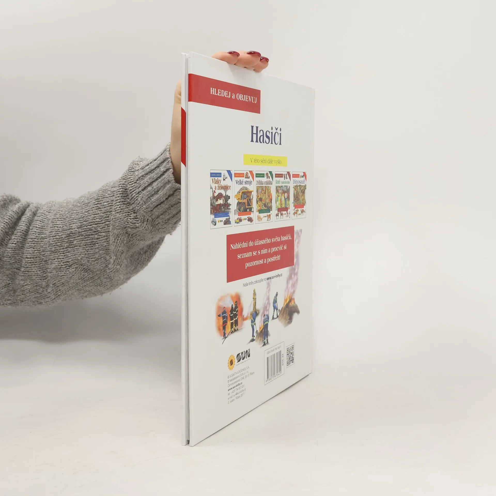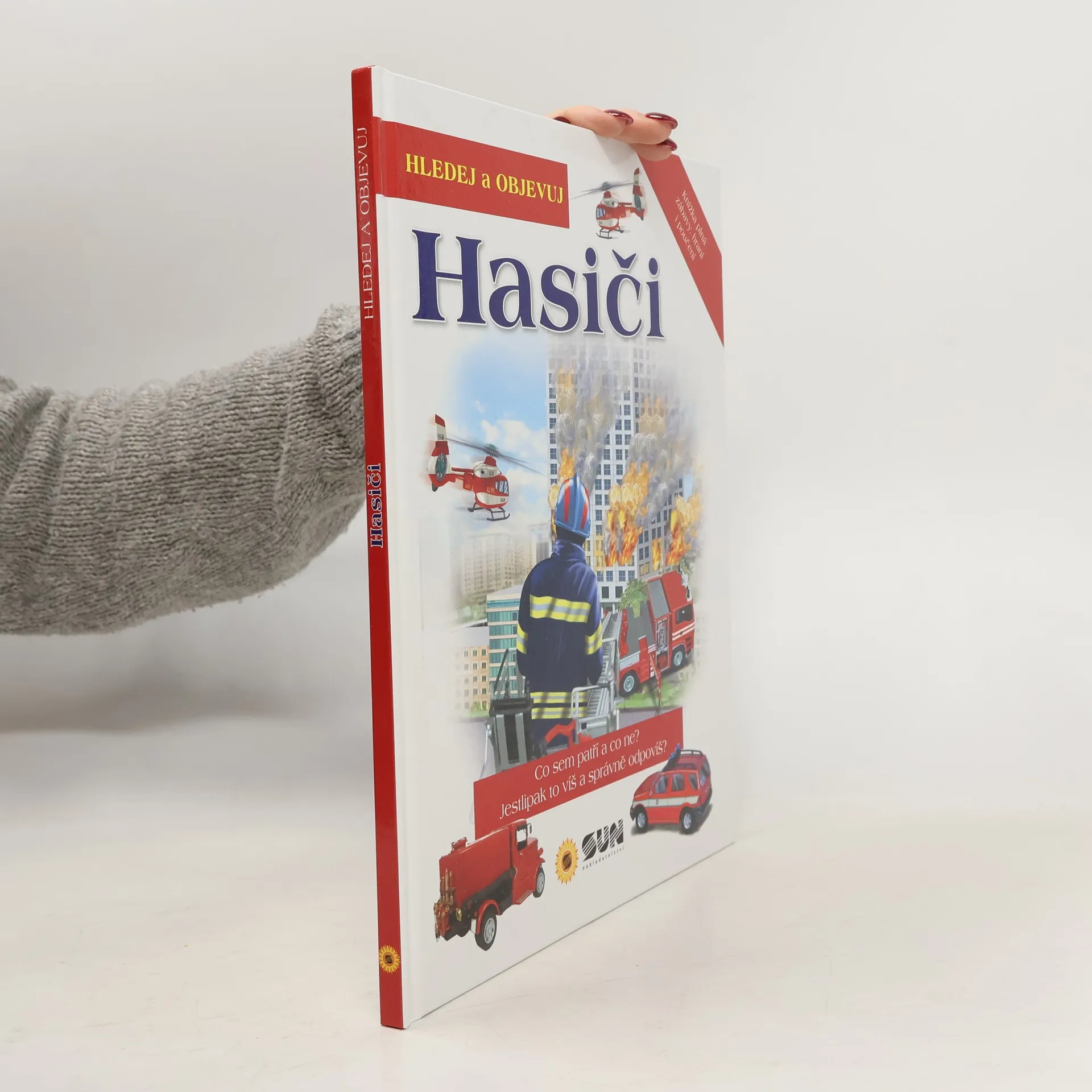Kniha představuje staré i moderní hasičské vozy, přípravu hasičů a záchranné práce v různých situacích. Každé kapitole je věnována dvoustrana s krátkými texty a barevnými ilustracemi, kde jsou navíc poschovávané různé předměty, které je potřeba najít.