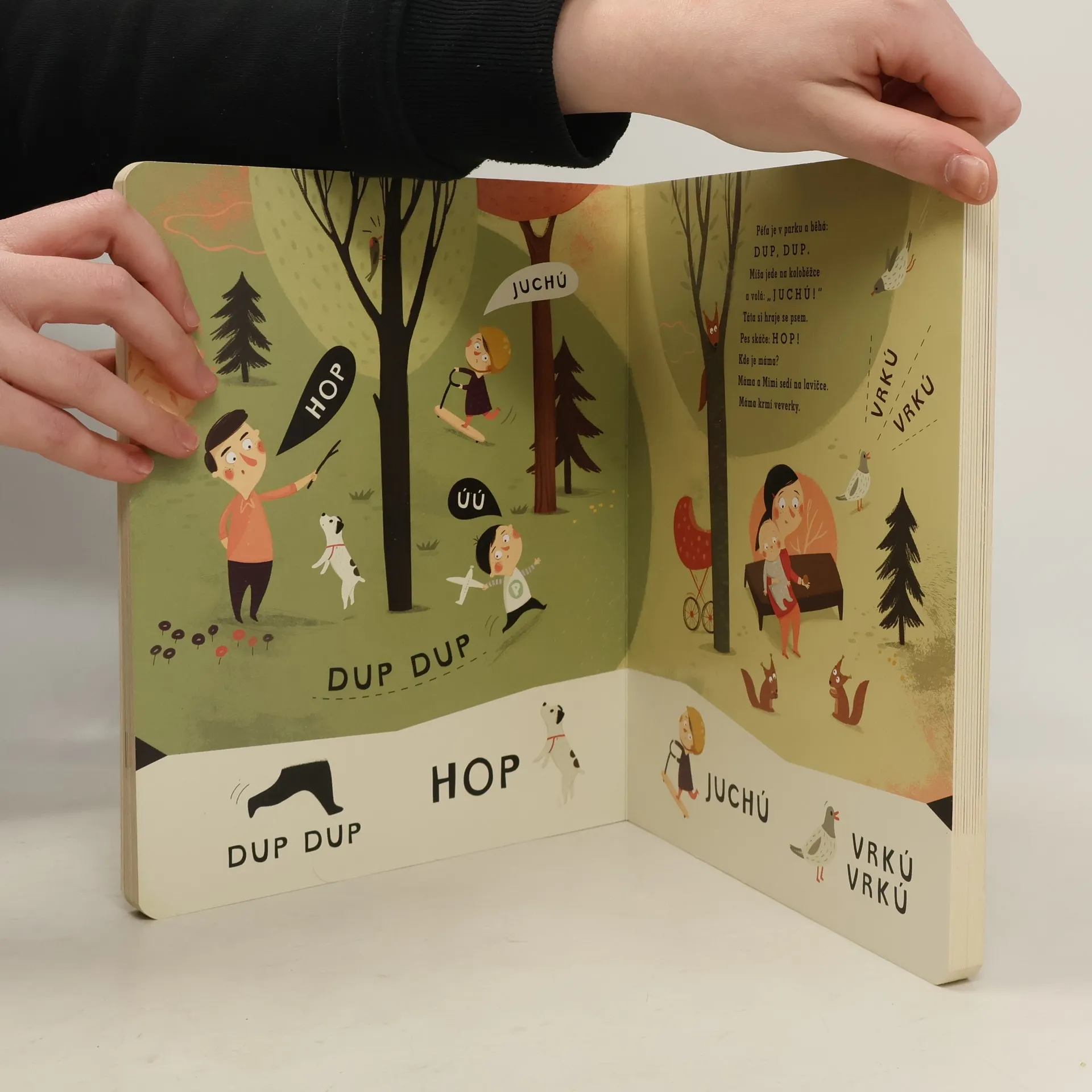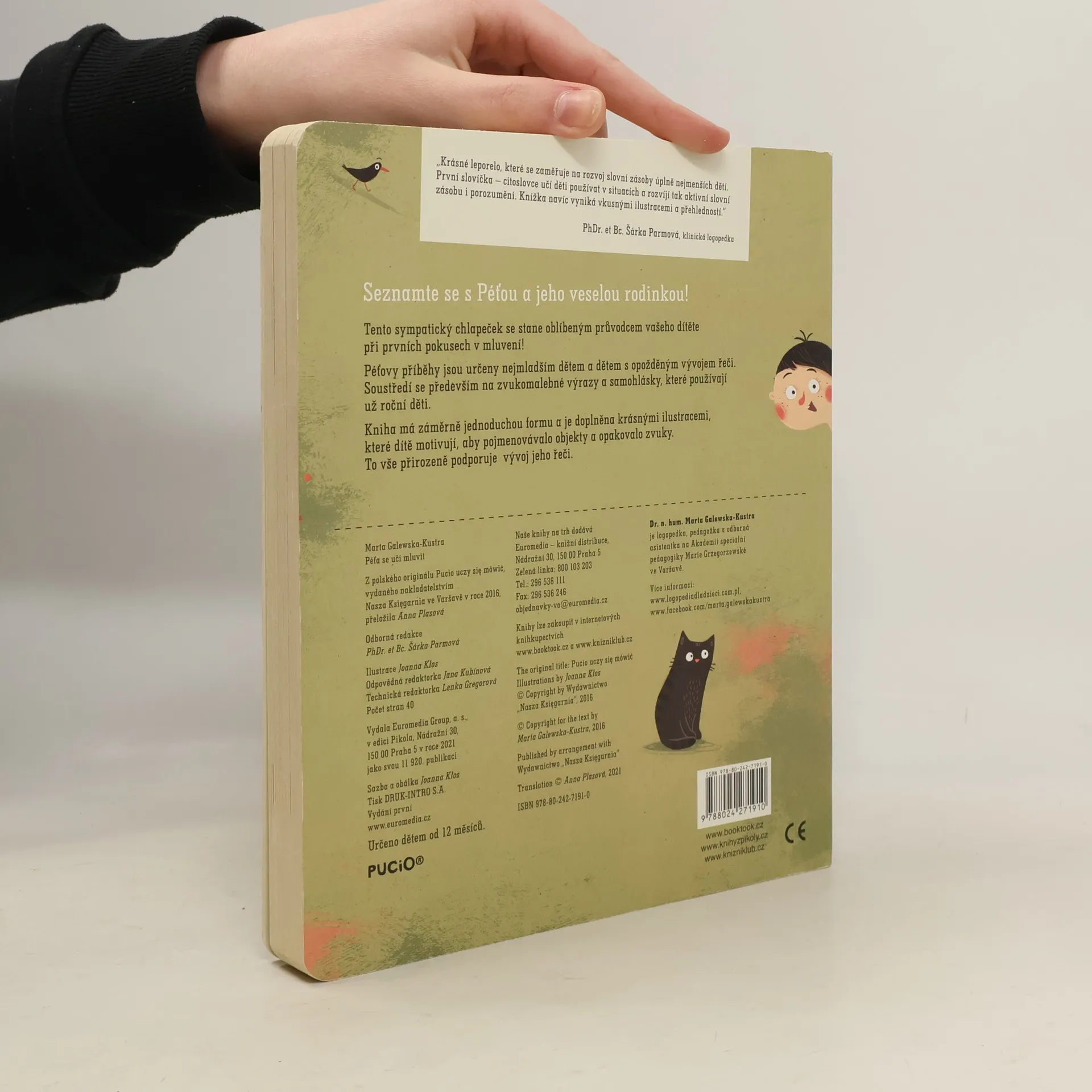 Seznamte se s Péťou a jeho veselou rodinkou! Krásně ilustrované leporelo se stane oblíbeným průvodcem při prvních krůčcích v mluvení. Soustředí se především na zvukomalebné výrazy a samohlásky, které používají už roční děti. Kniha má záměrně jednoduchou formu a je doplněna krásnými ilustracemi, které dítě motivují, aby pojmenovávalo objekty a opakovalo zvuky, což přirozeně vývoj jeho řeči podporuje. Leporelo je určeno dětem od 12 měsíců.