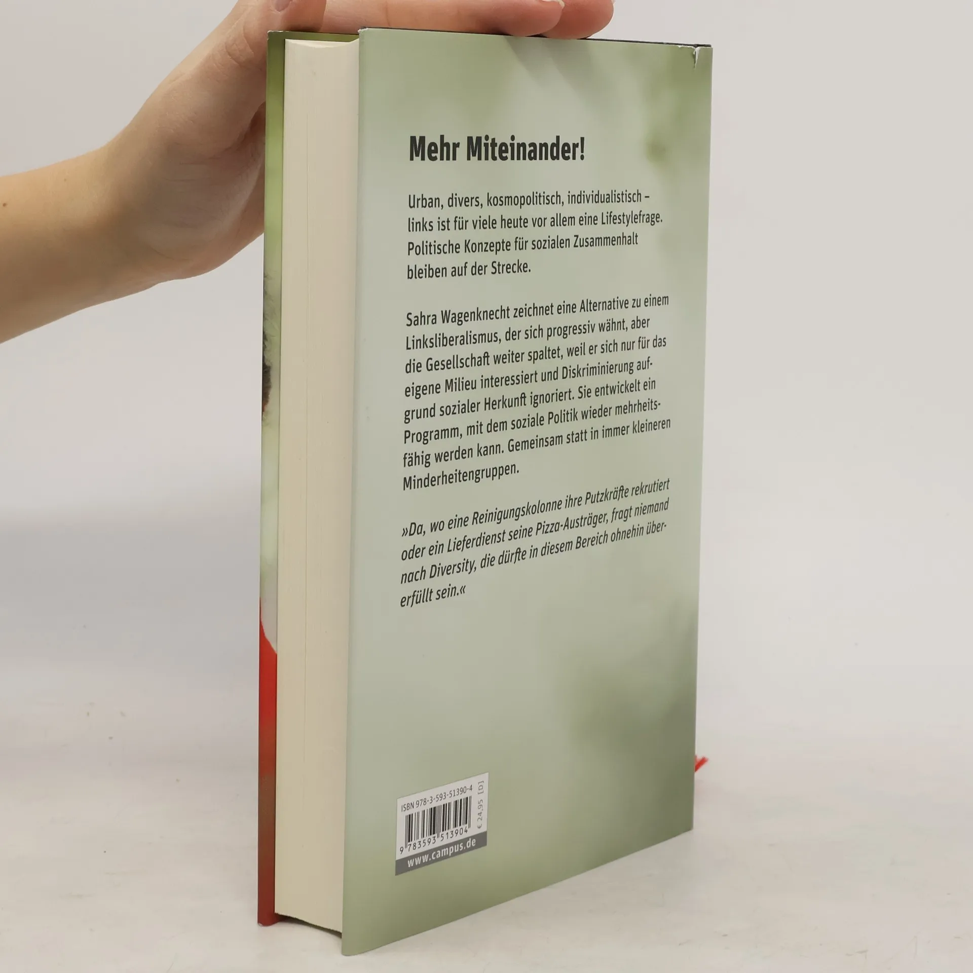 Urban, divers, kosmopolitisch, individualistisch – links ist für viele heute vor allem eine Lifestylefrage. Politische Konzepte für sozialen Zusammenhalt bleiben auf der Strecke, genauso wie schlecht verdienende Frauen, arme Zuwandererkinder, ausgebeutete Leiharbeiter und große Teile der Mittelschicht. Ob in den USA oder Europa: Wer sich auf Gendersternchen konzentriert statt auf Chancengerechtigkeit und dabei Kultur und Zusammengehörigkeitsgefühl der Bevölkerungsmehrheit vernachlässigt, arbeitet der politischen Rechten in die Hände. Sahra Wagenknecht zeichnet in ihrem Buch eine Alternative zu einem Linksliberalismus, der sich progressiv wähnt, aber die Gesellschaft weiter spaltet, weil er sich nur für das eigene Milieu interessiert und Diskriminierung aufgrund sozialer Herkunft ignoriert. Sie entwickelt ein Programm, mit dem linke Politik wieder mehrheitsfähig werden kann. Gemeinsam statt egoistisch.