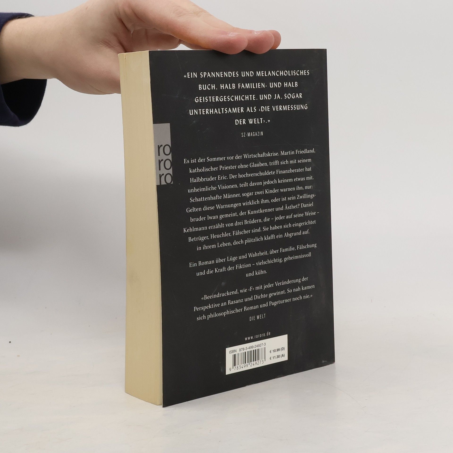Es ist der Sommer vor der Wirtschaftskrise. Martin Friedland, katholischer Priester ohne Glauben, trifft sich mit seinem Halbbruder Eric. Der hochverschuldete Finanzberater hat unheimliche Visionen, teilt davon jedoch keinem etwas mit. Schattenhafte Männer, sogar zwei Kinder warnen ihn, nur: Gelten diese Warnungen wirklich ihm, oder ist sein Zwillingsbruder Iwan gemeint, der Kunstkenner und Ästhet? Daniel Kehlmann erzählt von drei Brüdern, die – jeder auf seine Weise – Betrüger, Heuchler, Fälscher sind. Sie haben sich eingerichtet in ihrem Leben, doch plötzlich klafft ein Abgrund auf. Ein Roman über Lüge und Wahrheit, über Familie, Fälschung und die Kraft der Fiktion – vielschichtig, geheimnisvoll und kühn.