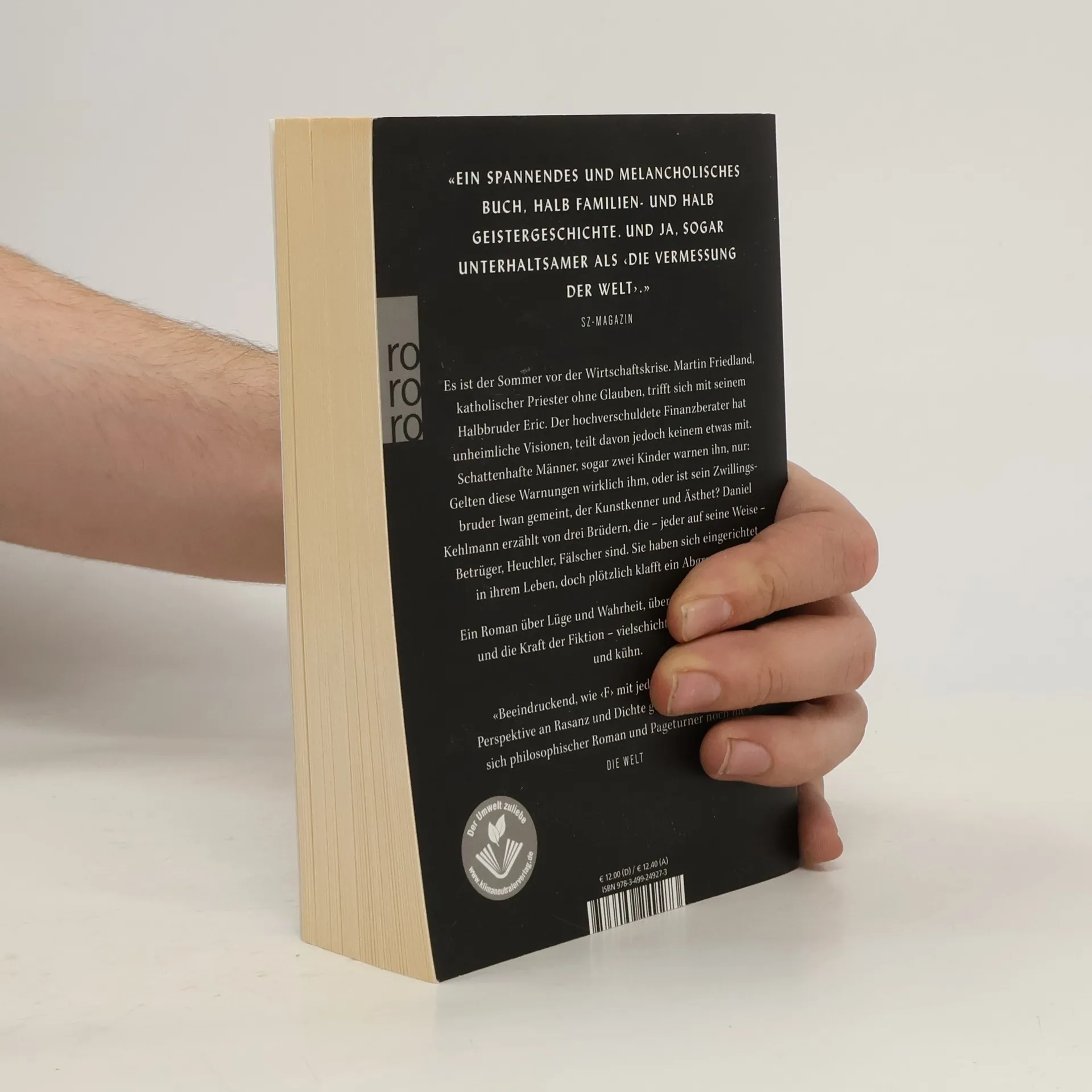 Es ist der Sommer vor der Wirtschaftskrise. Martin Friedland, katholischer Priester ohne Glauben, trifft sich mit seinem Halbbruder Eric. Der hochverschuldete Finanzberater hat unheimliche Visionen, teilt davon jedoch keinem etwas mit. Schattenhafte Männer, sogar zwei Kinder warnen ihn, nur: Gelten diese Warnungen wirklich ihm, oder ist sein Zwillingsbruder Iwan gemeint, der Kunstkenner und Ästhet? Daniel Kehlmann erzählt von drei Brüdern, die – jeder auf seine Weise – Betrüger, Heuchler, Fälscher sind. Sie haben sich eingerichtet in ihrem Leben, doch plötzlich klafft ein Abgrund auf. Ein Roman über Lüge und Wahrheit, über Familie, Fälschung und die Kraft der Fiktion – vielschichtig, geheimnisvoll und kühn.
