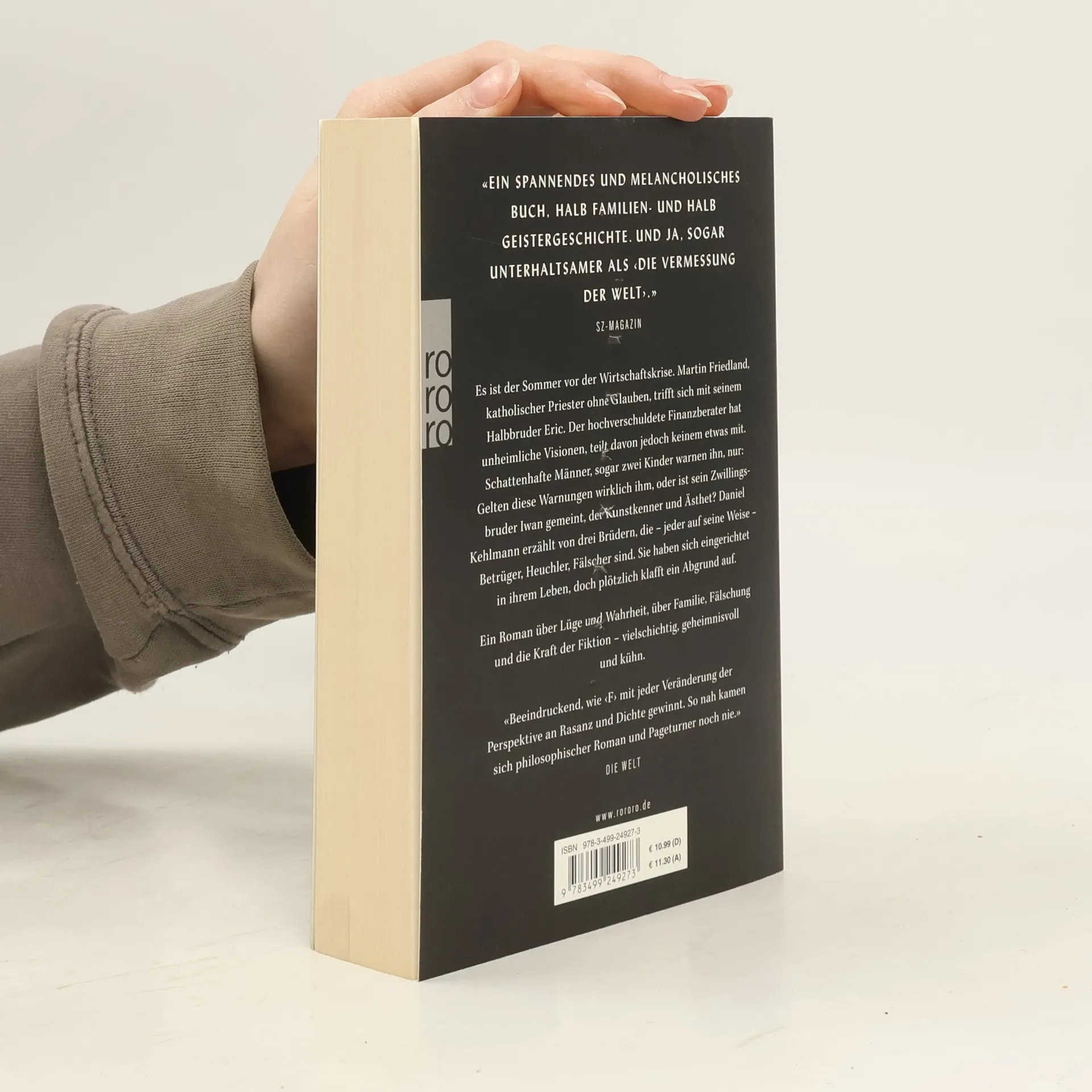 Es ist der Sommer vor der Wirtschaftskrise. Martin Friedland, katholischer Priester ohne Glauben, trifft sich mit seinem Halbbruder Eric. Der hochverschuldete Finanzberater hat unheimliche Visionen, teilt davon jedoch keinem etwas mit. Schattenhafte Männer, sogar zwei Kinder warnen ihn, nur: Gelten diese Warnungen wirklich ihm, oder ist sein Zwillingsbruder Iwan gemeint, der Kunstkenner und Ästhet? Daniel Kehlmann erzählt von drei Brüdern, die – jeder auf seine Weise – Betrüger, Heuchler, Fälscher sind. Sie haben sich eingerichtet in ihrem Leben, doch plötzlich klafft ein Abgrund auf. Ein Roman über Lüge und Wahrheit, über Familie, Fälschung und die Kraft der Fiktion – vielschichtig, geheimnisvoll und kühn.