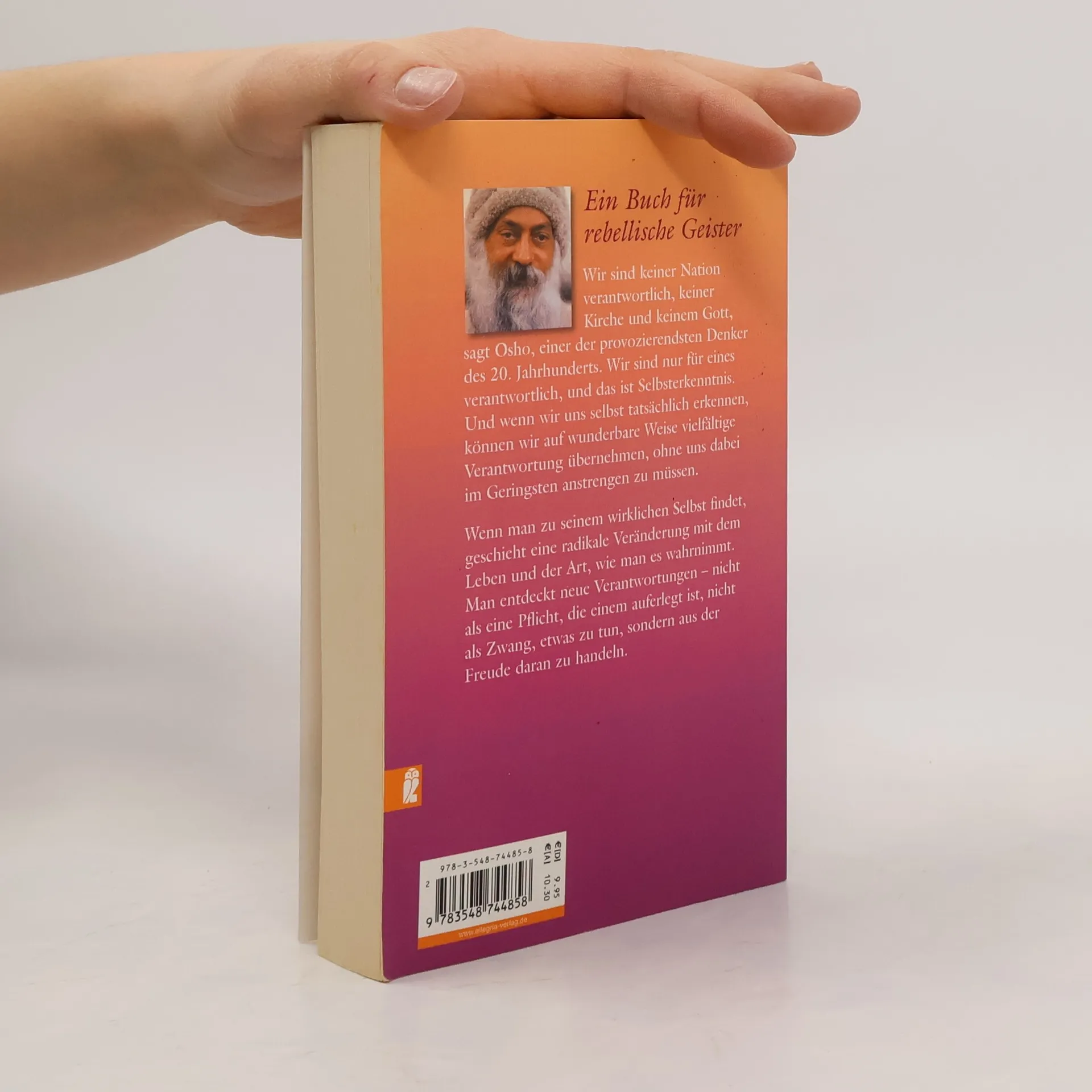 Wir sind keiner Nation verantwortlich, keiner Kirche und keinem Gott, sagt Osho, einer der provozierendsten Denker des 20. Jahrhunderts. Wir sind nur für eines verantwortlich, und das ist Selbsterkenntnis. Und wenn wir uns selbst tatsächlich erkennen, können wir auf wunderbare Weise vielfältige Verantwortung übernehmen, ohne uns dabei im geringsten anstrengen zu müssen. Wenn man zu seinem wirklichen Selbst findet, geschieht eine radikale Veränderung mit dem Leben und der Art, wie man es wahrnimmt. Man entdeckt neue Verantwortungen – nicht als eine Pflicht, die einem auferlegt ist, nicht als Zwang, etwas zu tun, sondern aus der Freude daran zu handeln. In diesem neuen Buch sind Vorträge zusammengestellt, die zum ersten Mal in deutscher Sprache erscheinen und sich mit der Frage beschäftigen, wie wir aus unseren vorgegebenen Glaubenssystemen und Weltbildern ausbrechen können. Es zeigt, welche neue Welt und welche neue Existenz wir erschaffen können, wenn wir wahre Freiheit erfahren und daraus verantwortlich handeln.