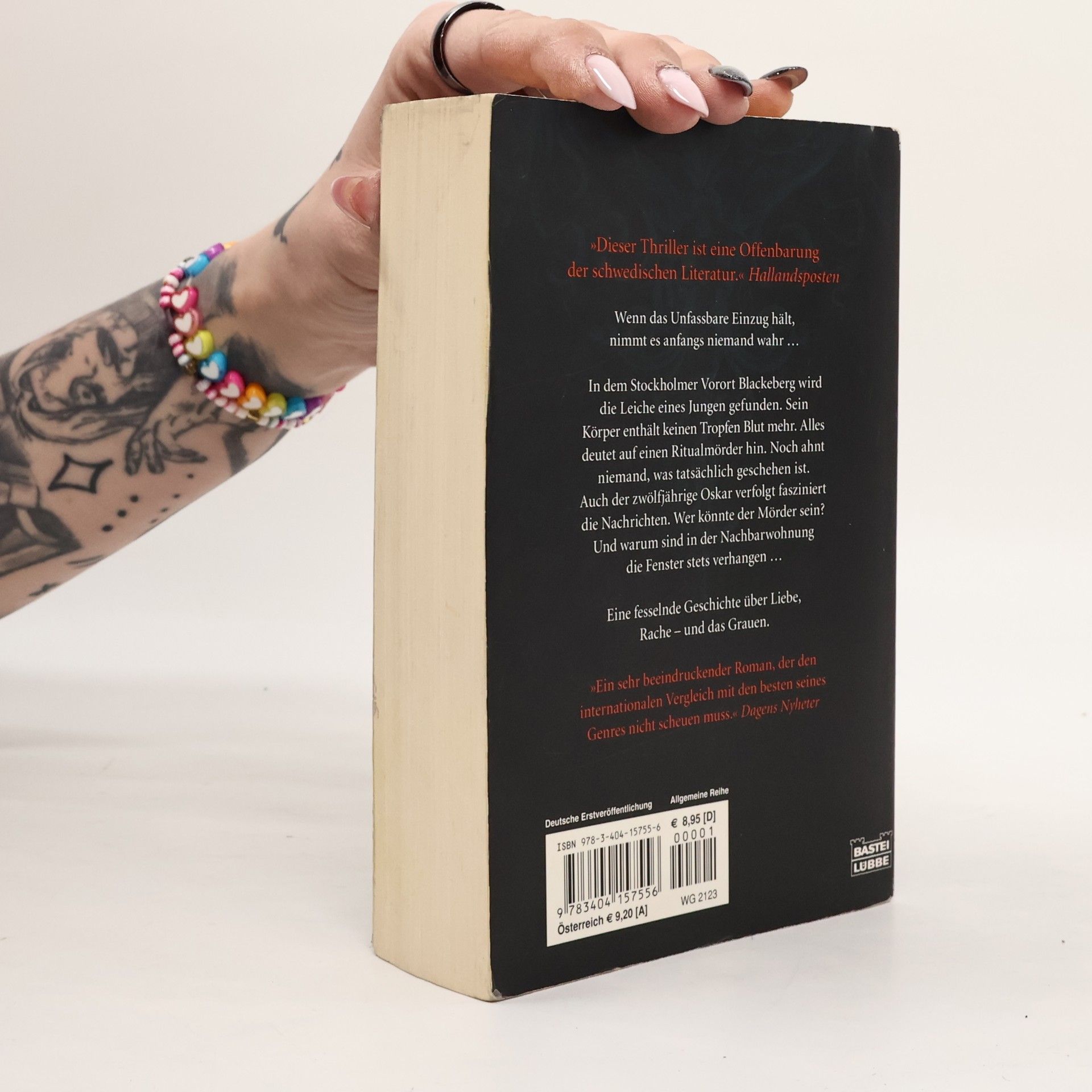 Wenn das Unfassbare Einzug hält, nimmt es anfangs niemand wahr ... In dem Stockholmer Vorort Blackeberg wird die Leiche eines Jungen gefunden. Sein Körper enthält keinen Tropfen Blut mehr. Alles deutet auf einen Ritualmörder hin. Noch ahnt niemand, was tatsächlich geschehen ist. Auch der zwölfjährige Oskar verfolgt fasziniert die Nachrichten. Wer könnte der Mörder sein? Und warum sind in der Nachbarwohnung die Fenster stets verhangen ... Eine fesselnde Geschichte über Liebe, Rache - und das Grauen.