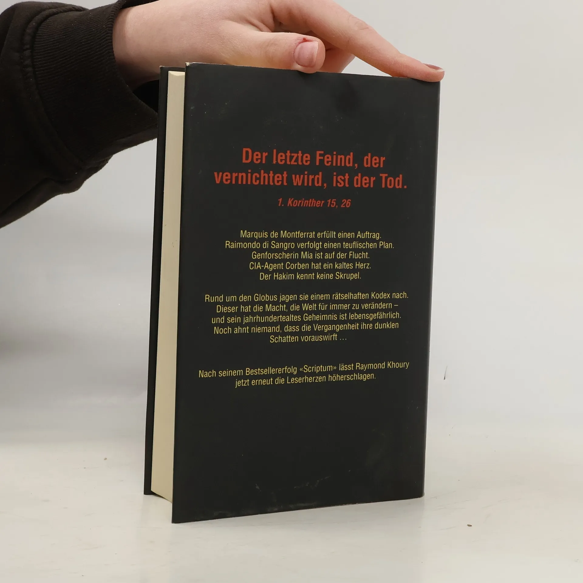 Der letzte Feind, der vernichtet wird, ist der Tod. 1. Korinther 15, 26Marquis de Montferrat erfüllt einen Auftrag.Raimondo di Sangro verfolgt einen teuflischen Plan.Genforscherin Mia ist auf der Flucht.CIA Agent Corben hat ein kaltes Herz.Der Hakim kennt keine Skrupel.Rund um den Globus jagen sie einem rätselhaften Kodex nach. Doch das Buch, das sie suchen, hat die Macht, die Welt für immer zu verändern – und sein jahrhundertealtes Geheimnis lebensgefährlich. Noch ahnt niemand, dass die Vergangenheit ihre dunklen Schatten voraus wirft …Nach seinem Bestsellererfolg „Scriptum“ lässt Raymond Khoury jetzt erneut die Leserherzen höher schlagen.