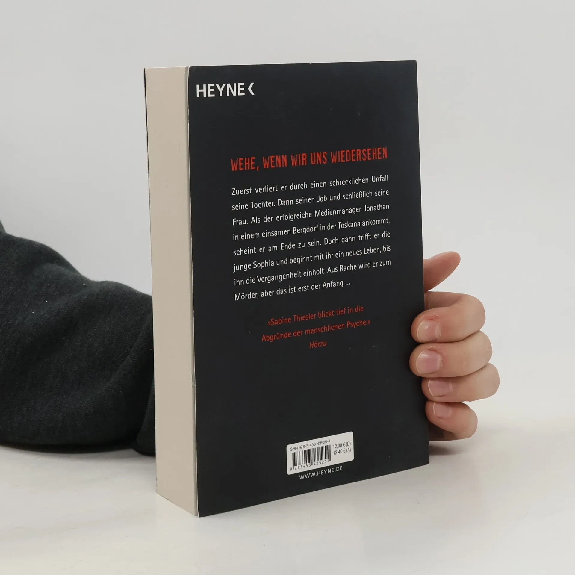 Wehe, wenn wir uns wiedersehen Zuerst verliert er durch einen schrecklichen Unfall seine Tochter. Dann seinen Job und schließlich seine Frau. Als der erfolgreiche Medienmanager Jonathan in einem einsamen Bergdorf in der Toskana ankommt, scheint er am Ende zu sein. Doch dann trifft er die junge Sophia und beginnt mit ihr ein neues Leben, bis ihn die Vergangenheit einholt. Aus Rache wird er zum Mörder, aber das ist erst der Anfang …