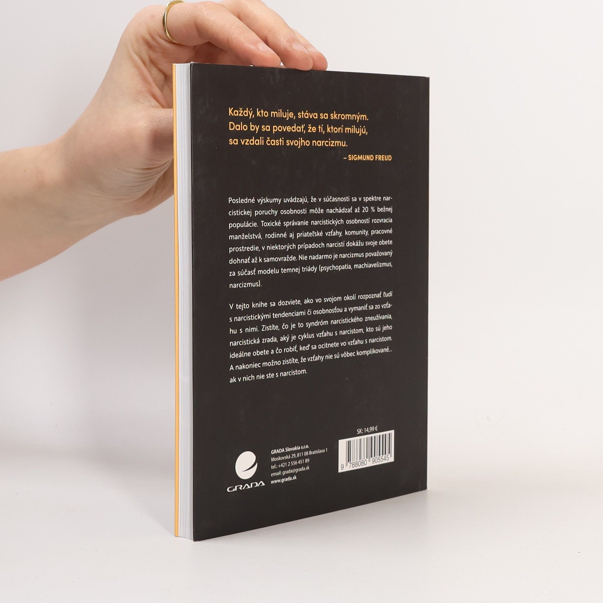 Posledné výskumy uvádzajú, že v súčasnosti sa v spektre narcistickej poruchy osobnosti môže nachádzať až 20 % bežnej populácie. Toxické správanie narcistických osobností rozvracia manželstvá, rodinné aj priateľské vzťahy, komunity, pracovné prostredie, v niektorých prípadoch narcisti dokážu svoje obete dohnať až k samovražde. Nie nadarmo je narcizmus považovaný za súčasť modelu temnej triády (psychopatia, machiavelizmus, narcizmus). V tejto knihe sa dozviete, ako vo svojom okolí rozpoznať ľudí s narcistickými tendenciami či osobnosťou a vymaniť sa zo vzťahu s nimi. Zistíte, čo je to syndróm narcistického zneužívania, narcistická zrada, aký je cyklus vzťahu s narcistom, kto sú jeho ideálne obete a čo robiť, keď sa ocitnete vo vzťahu s narcistom. A nakoniec možno zistíte, že vzťahy nie sú vôbec komplikované... ak v nich nie ste s narcistom.