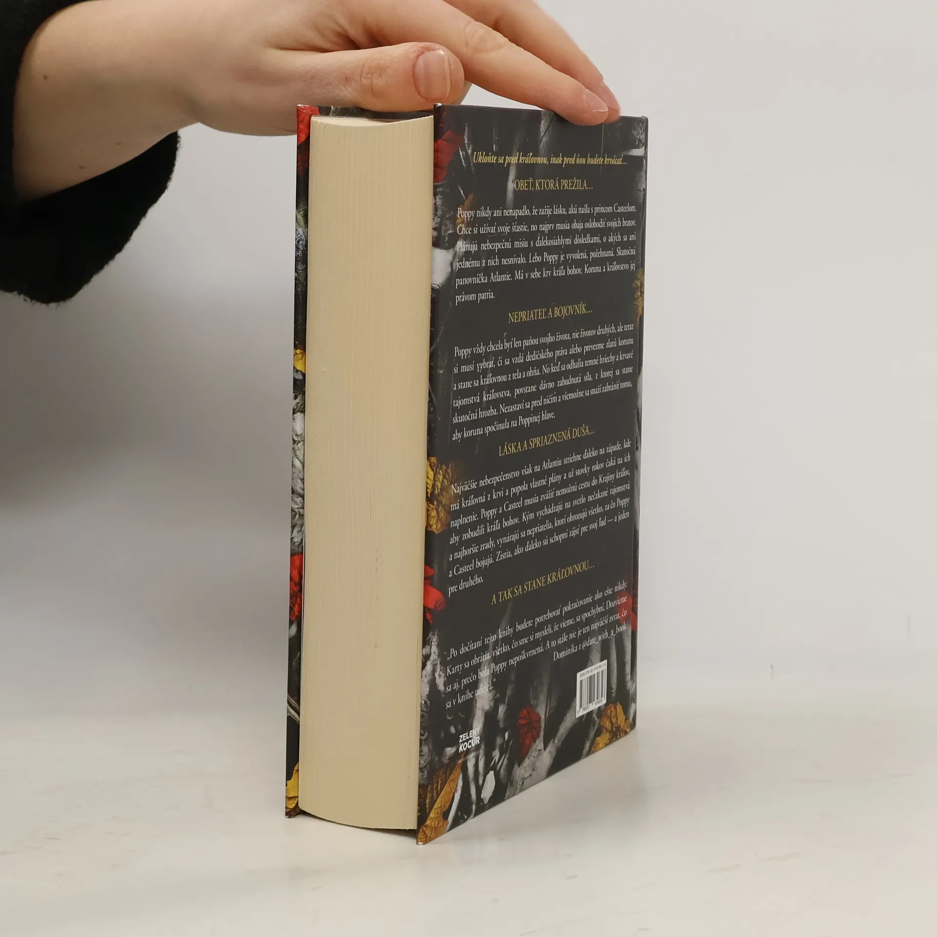 Ukloňte sa pred kráľovnou, inak pred ňou budete krvácať…OBEŤ, KTORÁ PREŽILA…Poppy nikdy ani nenapadlo, že zažije lásku, akú našla s princom Casteelom. Chce si užívať svoje šťastie, no najprv musia obaja oslobodiť svojich bratov. Plánujú nebezpečnú misiu s ďalekosiahlymi dôsledkami, o akých sa ani jednému z nich nesnívalo. Lebo Poppy je vyvolená, požehnaná. Skutočná panovníčka Atlantie. Má v sebe krv kráľa bohov. Koruna a kráľovstvo jej právom patria.NEPRIATEĽ A BOJOVNÍK…Poppy vždy chcela byť len paňou svojho života, nie životov druhých, ale teraz si musí vybrať, či sa vzdá dedičského práva alebo prevezme zlatú korunu a stane sa kráľovnou z tela a ohňa. No keď sa odhalia temné hriechy a krvavé tajomstvá kráľovstva, povstane dávno zabudnutá sila, z ktorej sa stane skutočná hrozba. Nezastaví sa pred ničím a všemožne sa snaží zabrániť tomu, aby koruna spočinula na Poppinej hlave.LÁSKA A SPRIAZNENÁ DUŠA…Najväčšie nebezpečenstvo však na Atlantiu striehne ďaleko na západe, kde má kráľovná z krvi a popola vlastné plány a už stovky rokov čaká na ich naplnenie. Poppy a Casteel musia zvážiť nemožnú cestu do Krajiny kráľov, aby zobudili kráľa bohov. Kým vychádzajú na svetlo nečakané tajomstvá a najhoršie zrady, vynárajú sa nepriatelia, ktorí ohrozujú všetko, za čo Poppy a Casteel bojujú. Zistia, ako ďaleko sú schopní zájsť pre svoj ľud — a jeden pre druhého.A TAK SA STANE KRÁĽOVNOU…