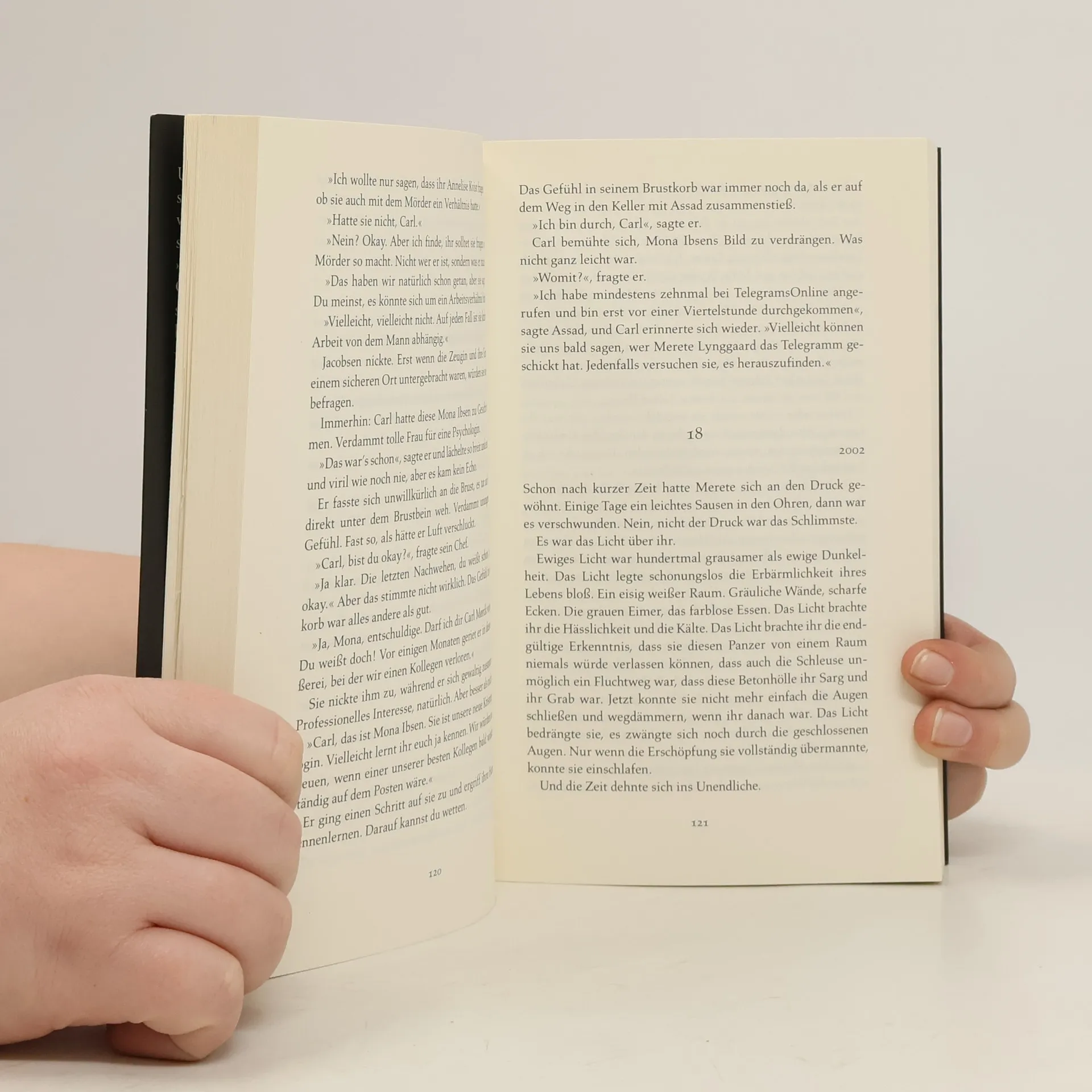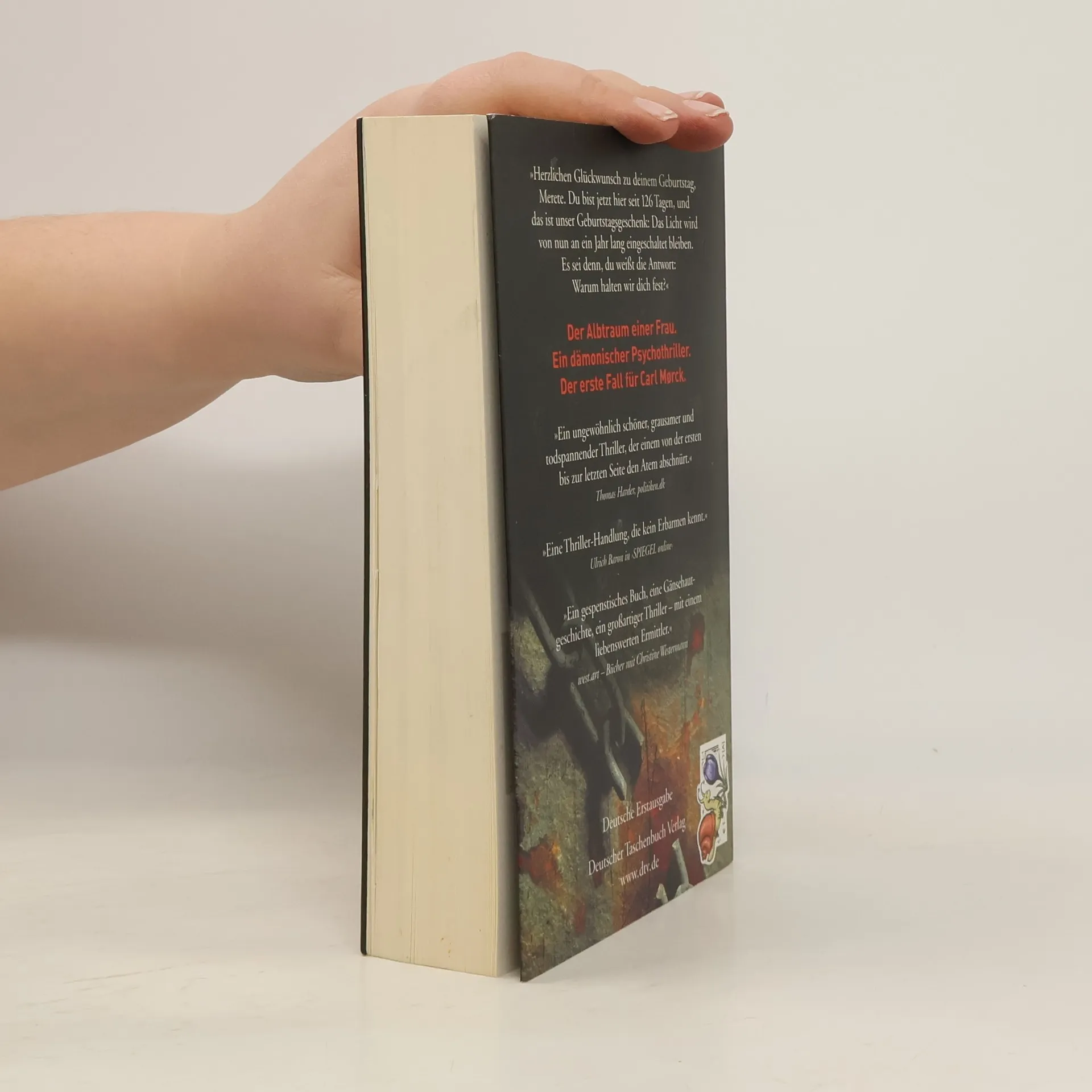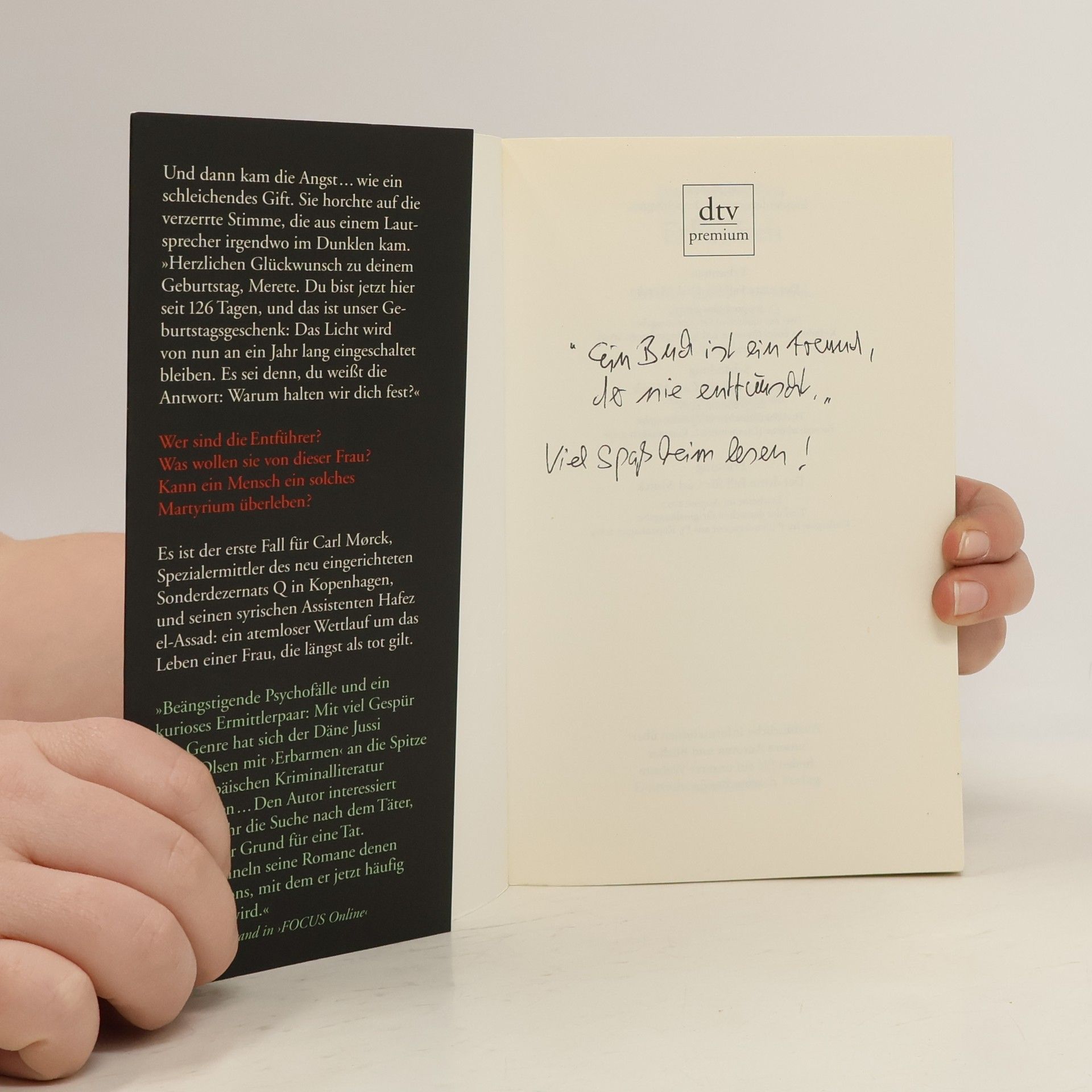 Und dann kam die Angst wie ein schleichendes Gift. Der Albtraum einer Frau.Ein dämonischer Psychothriller.Der erste Fall für Carl Mørckvom Sonderdezernat Q in Kopenhagen. Die verzerrte Stimme kam aus einem Lautsprecher irgendwo im Dunklen: »Herzlichen Glückwunsch zu deinem Geburtstag, Merete. Du bist jetzt hier seit 126 Tagen, und das ist unser Geburtstagsgeschenk: Das Licht wird von nun an ein Jahr lang eingeschaltet bleiben. Es sei denn, du weißt die Antwort: Warum halten wir dich fest?« Am 2. März 2002 verschwindet eine Frau spurlos auf der Fähre von Rødby nach Puttgarden, man vermutet Tod durch Ertrinken. Doch sie ist nicht tot, sondern wird in einem Gefängnis aus Beton gefangen gehalten. Wer sind die Täter? Was wollen sie von dieser Frau? Und: Kann ein Mensch ein solches Martyrium überleben? ››Ein ungewöhnlich schöner und hochspannender Thriller, der einem bis zur letzten Seite den Atem abschnürt.‹‹ politiken. dk Trailer ansehen auf www. adler-olsen. de