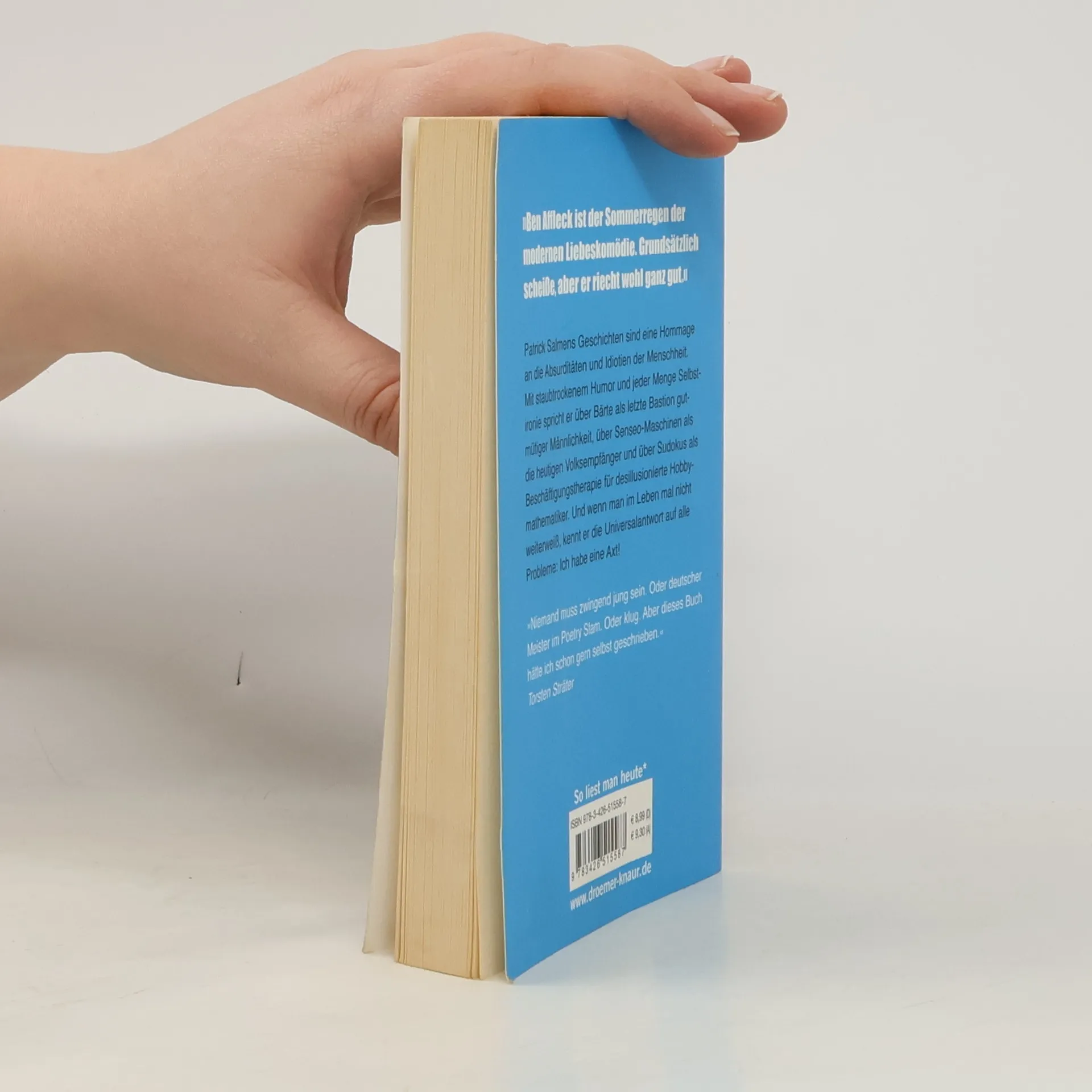 Mit staubtrockenem Humor und jeder Menge Selbstironie entlarvt der Poetry Slammer Patrick Salmen in seinen Geschichten die Absurditäten und Idiotien der Menschheit. Mal spöttisch, mal böse, aber immer mit einem charmanten Augenzwinkern spricht er über Bärte als letzte Bastion gutmütiger Männlichkeit, über Senseo-Maschinen als die heutigen Volksempfänger und über Sudokus als Beschäftigungstherapie für desillusionierte Hobbymathematiker. Und wenn man im Leben mal nicht weiter weiß, kennt er die Universalantwort auf alle Probleme: Ich habe eine Axt!