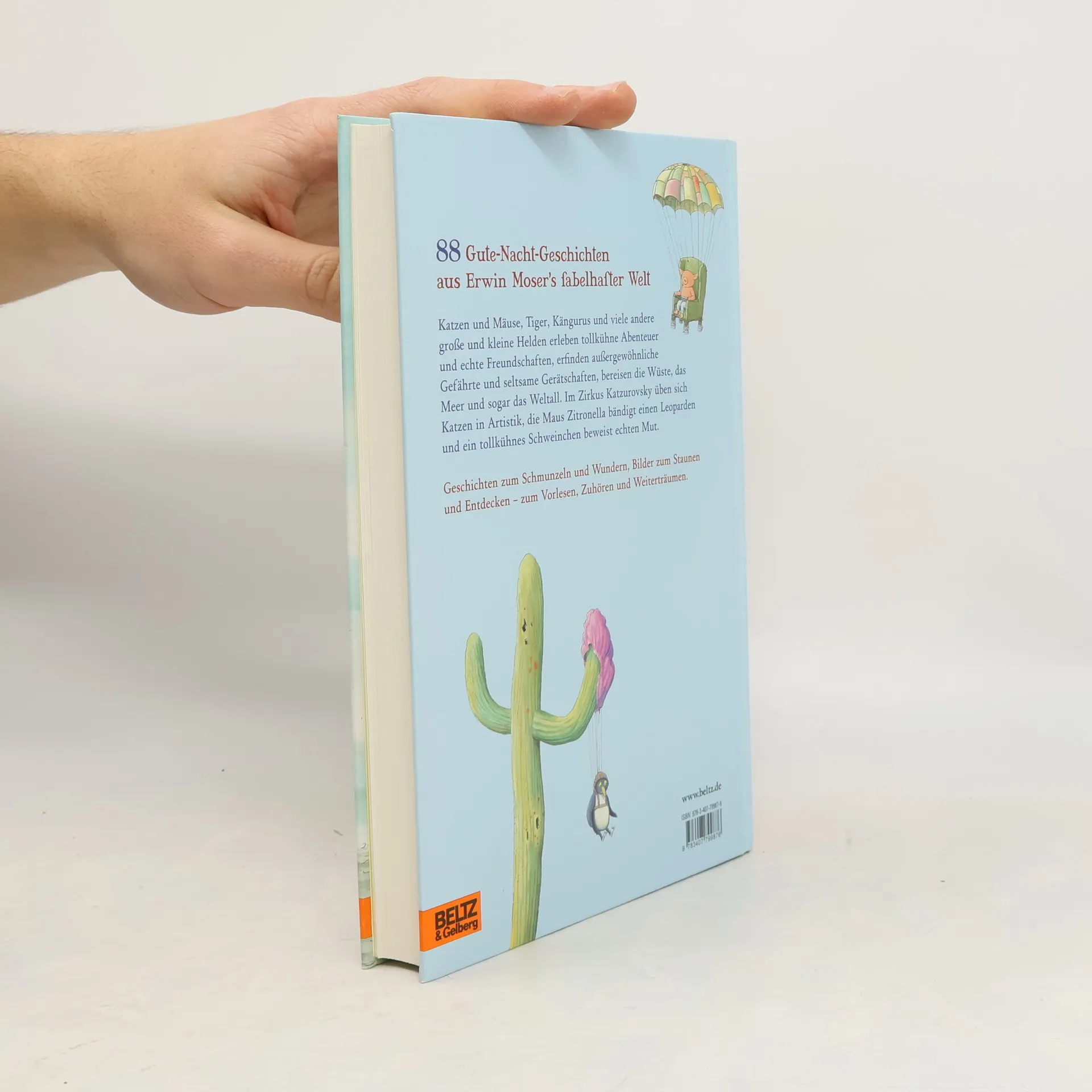 Große Fabulierkunst für die Kleinen: Die schönsten Gute-Nacht-Geschichten für Frühling, Sommer, Herbst und Winter. Opulent bebildert mit einer ganzseitigen Illustration zu jeder Geschichte - zum Vorlesen, Zuhören und Weiterträumen. Acht Kater balancieren im Zirkus Katzurovsky auf Ball, Nudelwalker und Flasche. Das Teekannenauto von Mäusemechaniker Sigurd düst über die Straßen und kocht dabei Tee. Ein rosarotes Zebra, ein violetter Koalabär und ein Leopardenhase reisen übers Meer. Erwin Mosers tierische Helden erleben tollkühne Abenteuer und echte Freundschaften, erfinden außergewöhnliche Gefährte und seltsame Gerätschaften. Trotz aller Abenteuer schaffen die liebevoll erzählten Geschichten und detailreichen Illustrationen eine geborgene Stimmung, in der Kinder beruhigt einschlafen können. »Harmonie und Gemütlichkeit bestimmen diese frei fabulierte Welt, die in den Illustrationen ihre Entsprechung findet. Ideale Geschichten als Betthupferl!« Der Standard, Wien