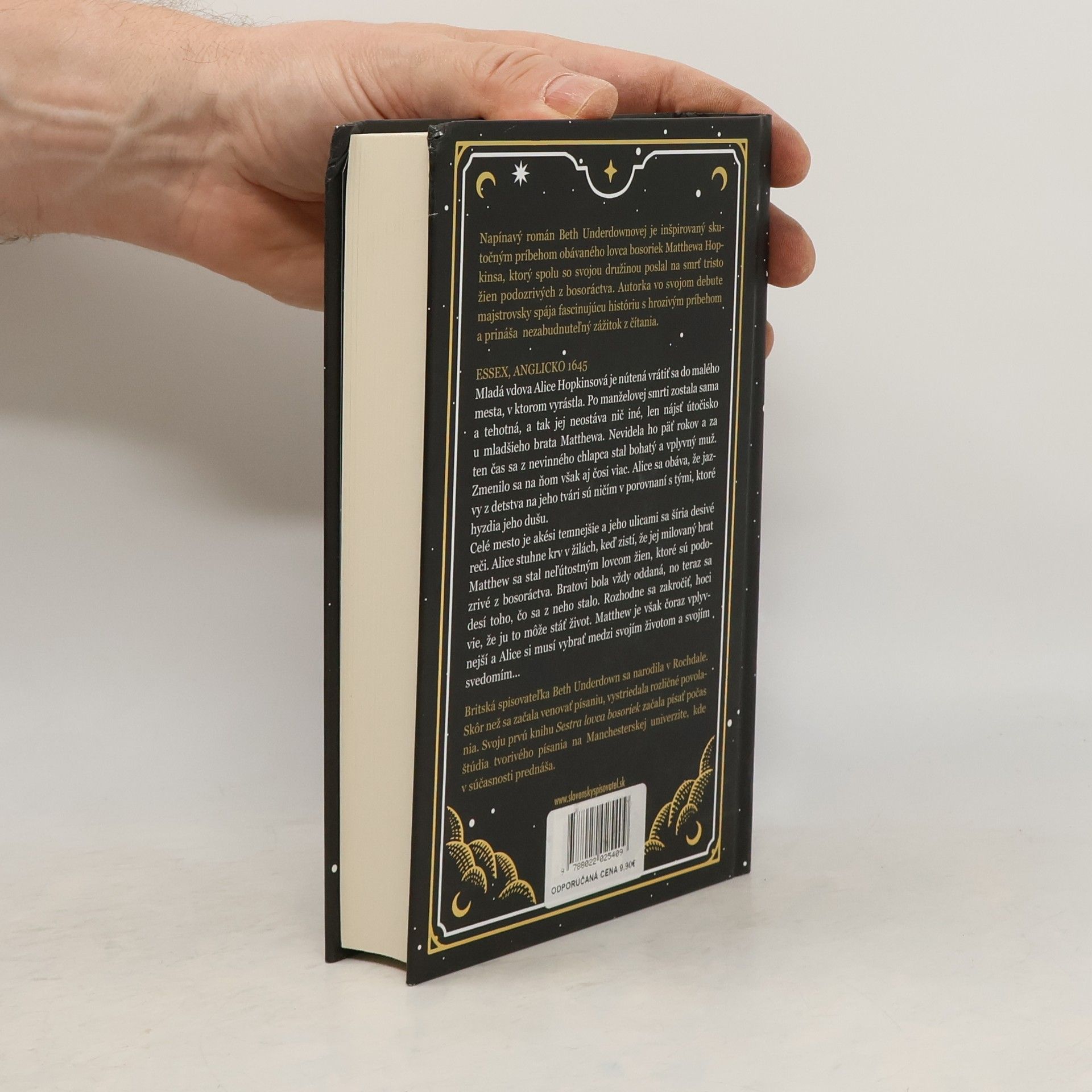 Napínavý román Beth Underdownovej je inšpirovaný skutočným príbehom lovca bosoriek Matthewa Hopkinsa, ktorý poslal na smrť tristo žien podozrivých z bosoráctva. Autorka majstrovsky spája fascinujúcu históriu s hrozivým príbehom, čím ponúka nezabudnuteľný zážitok. V Essexu v roku 1645 sa mladá vdova Alice Hopkinsová vracia do svojho rodného mesta po manželovej smrti. Tehotná a bez pomoci, hľadá útočisko u svojho brata Matthewa, ktorý sa po piatich rokoch zmenil na bohatého a vplyvného muža. Alice sa obáva, že jazvy na jeho tvári sú len odrazom hlbších rán na jeho duši. Mesto je zahalené temnotou a desivými rečami, keď Alice zistí, že Matthew sa stal neľútostným lovcom žien podozrivých z bosoráctva. Napriek oddanosti svojmu bratovi sa desí jeho premeny a rozhodne sa zakročiť, aj keď to môže stáť jej život. Matthewova moc rastie a Alice musí vybrať medzi svojím životom a svedomím. Beth Underdown, britská spisovateľka, začala písať počas štúdia na Manchesterskej univerzite, kde aj prednáša. Jej debut získal HWA Goldsboro Crown Award a stal sa bestsellerom Knižného klubu Richarda a Judy. Recenzie vyzdvihujú majstrovské prelínanie historických faktov a fikcie, pričom postava Alice patrí medzi najpozoruhodnejšie ženské postavy súčasných historických románov.