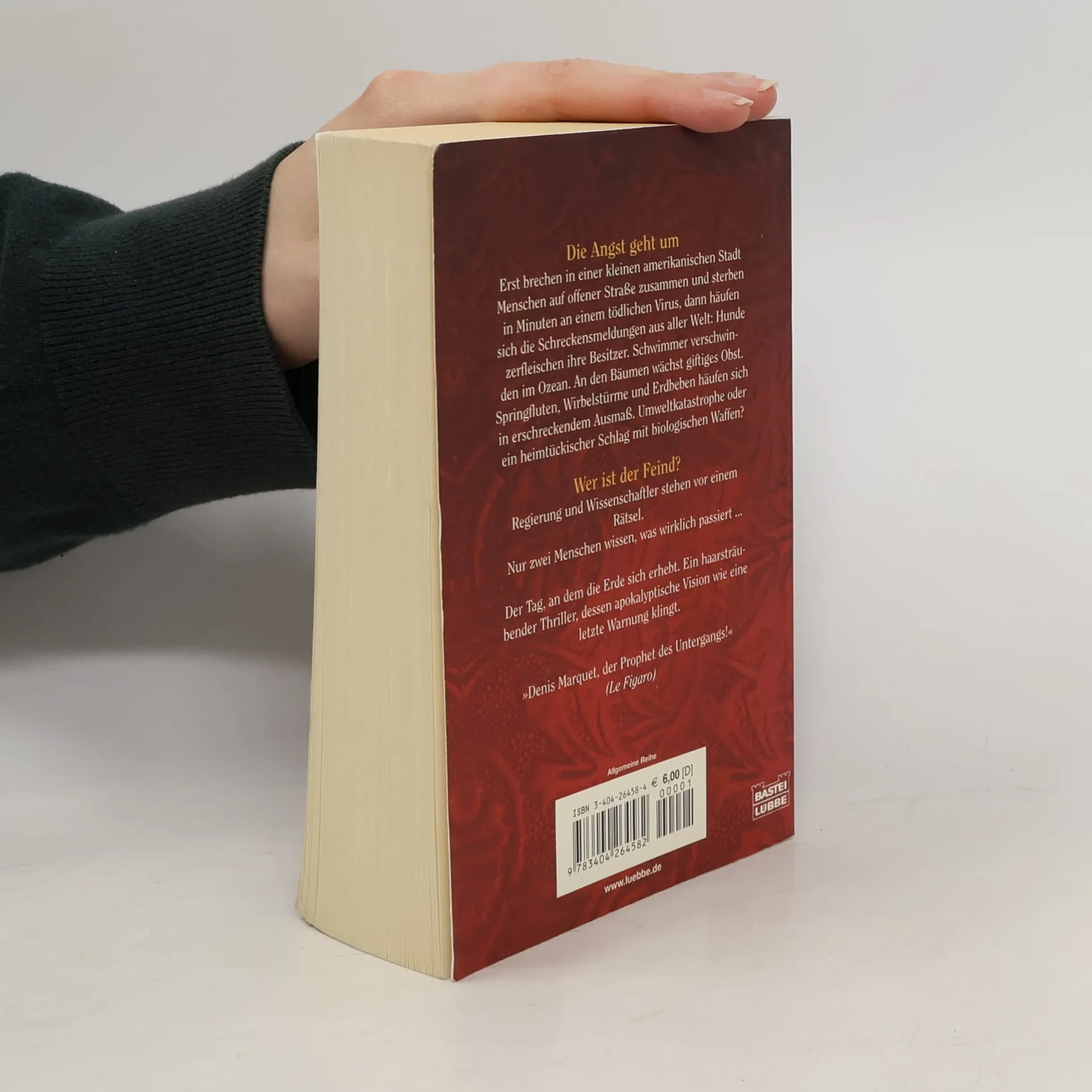 Die Angst geht um. Erst brechen in einer kleinen amerikanischen Stadt Menschen auf offener Straße zusammen und sterben in Minuten an einem tödlichen Virus, dann häufen sich die Schreckensmeldungen aus aller Welt: Hunde zerfleischen ihre Besitzer. Schwimmer verschwinden im Ozean. An den Bäumen wächst giftiges Obst. Springfluten, Wirbelstürme und Erdbeben häufen sich in erschreckendem Ausmaß. Umweltkatastrophe oder ein heimtückischer Schlag mit biologischen Waffen? Wer ist der Feind? Regierung und Wissenschaftler stehen vor einem Rätsel. Nur zwei Menschen wissen, was wirklich passiert ...