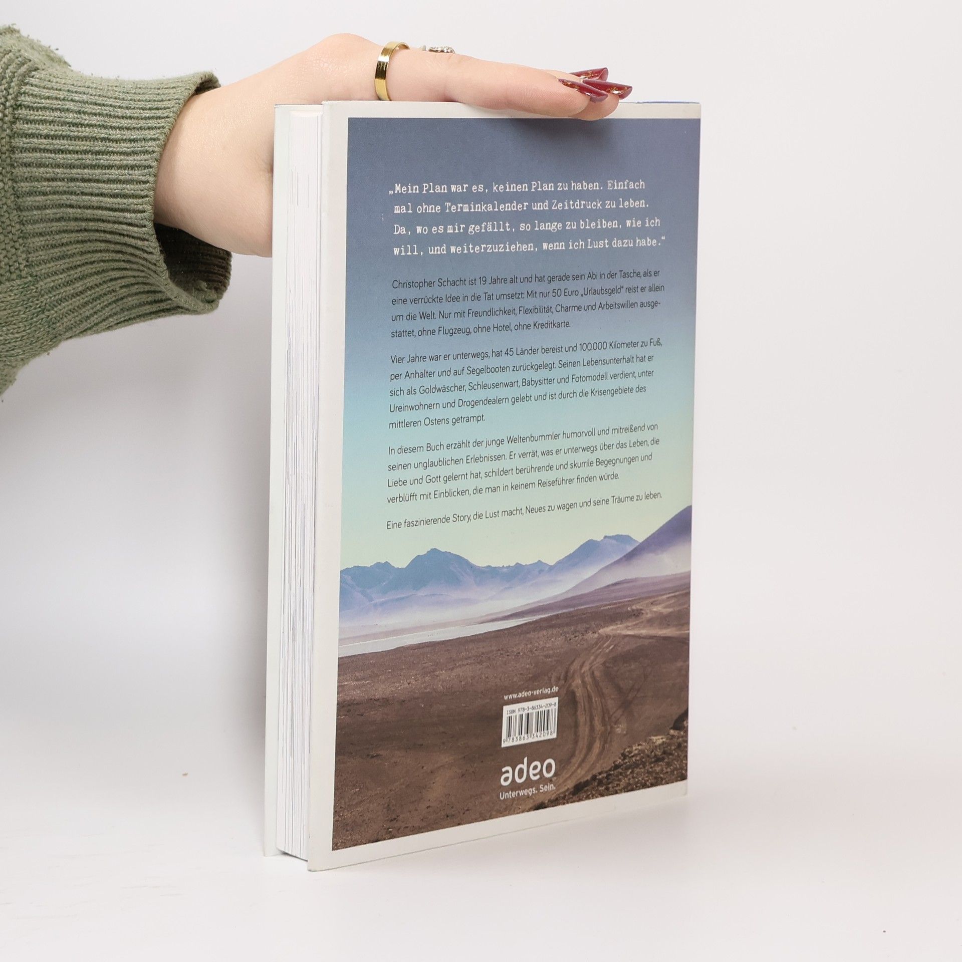 Christopher Schacht ist erst 19 Jahre alt und hat gerade sein Abi in der Tasche, als er eine verrückte Idee in die Tat umsetzt: Mit nur 50 Euro „Urlaubsgeld“ reist er allein um die Welt. Nur mit Freundlichkeit, Flexibilität, Charme und Arbeitswillen ausgestattet, ohne Flugzeug, ohne Hotel, ohne Kreditkarte. Vier Jahre war er unterwegs, hat 45 Länder bereist und 100.000 Kilometer zu Fuß, per Anhalter und auf Segelbooten zurückgelegt. Seinen Lebensunterhalt hat er sich als Goldwäscher, Schleusenwart, Babysitter und Fotomodell verdient, unter Ureinwohnern und Drogendealern gelebt und ist durch die Krisengebiete des mittleren Ostens getrampt. In diesem Buch erzählt der junge Weltenbummler auf humorvolle und mitreißende Art von seinen unglaublichen Erlebnissen. Er verrät, was er unterwegs über das Leben, die Liebe und Gott gelernt hat, schildert berührende und skurrile Begegnungen und verblüfft mit Einblicken, die man in keinem Reiseführer finden würde. Eine faszinierende Story, die Lust macht, Neues zu wagen und seine Träume zu leben!