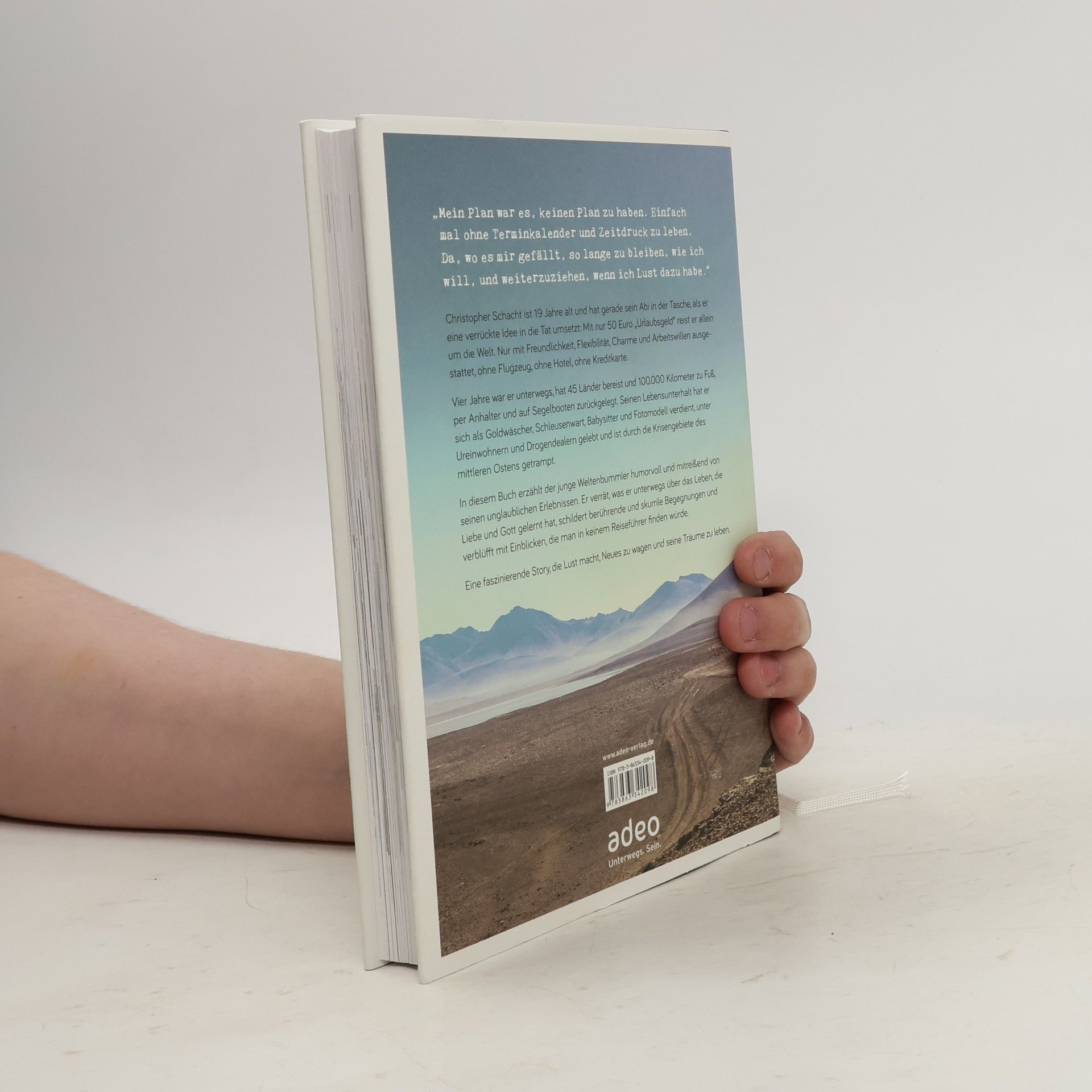 Christopher Schacht ist erst 19 Jahre alt und hat gerade sein Abi in der Tasche, als er eine verrückte Idee in die Tat umsetzt: Mit nur 50 Euro „Urlaubsgeld“ reist er allein um die Welt. Nur mit Freundlichkeit, Flexibilität, Charme und Arbeitswillen ausgestattet, ohne Flugzeug, ohne Hotel, ohne Kreditkarte. Vier Jahre war er unterwegs, hat 45 Länder bereist und 100.000 Kilometer zu Fuß, per Anhalter und auf Segelbooten zurückgelegt. Seinen Lebensunterhalt hat er sich als Goldwäscher, Schleusenwart, Babysitter und Fotomodell verdient, unter Ureinwohnern und Drogendealern gelebt und ist durch die Krisengebiete des mittleren Ostens getrampt. In diesem Buch erzählt der junge Weltenbummler auf humorvolle und mitreißende Art von seinen unglaublichen Erlebnissen. Er verrät, was er unterwegs über das Leben, die Liebe und Gott gelernt hat, schildert berührende und skurrile Begegnungen und verblüfft mit Einblicken, die man in keinem Reiseführer finden würde. Eine faszinierende Story, die Lust macht, Neues zu wagen und seine Träume zu leben!
