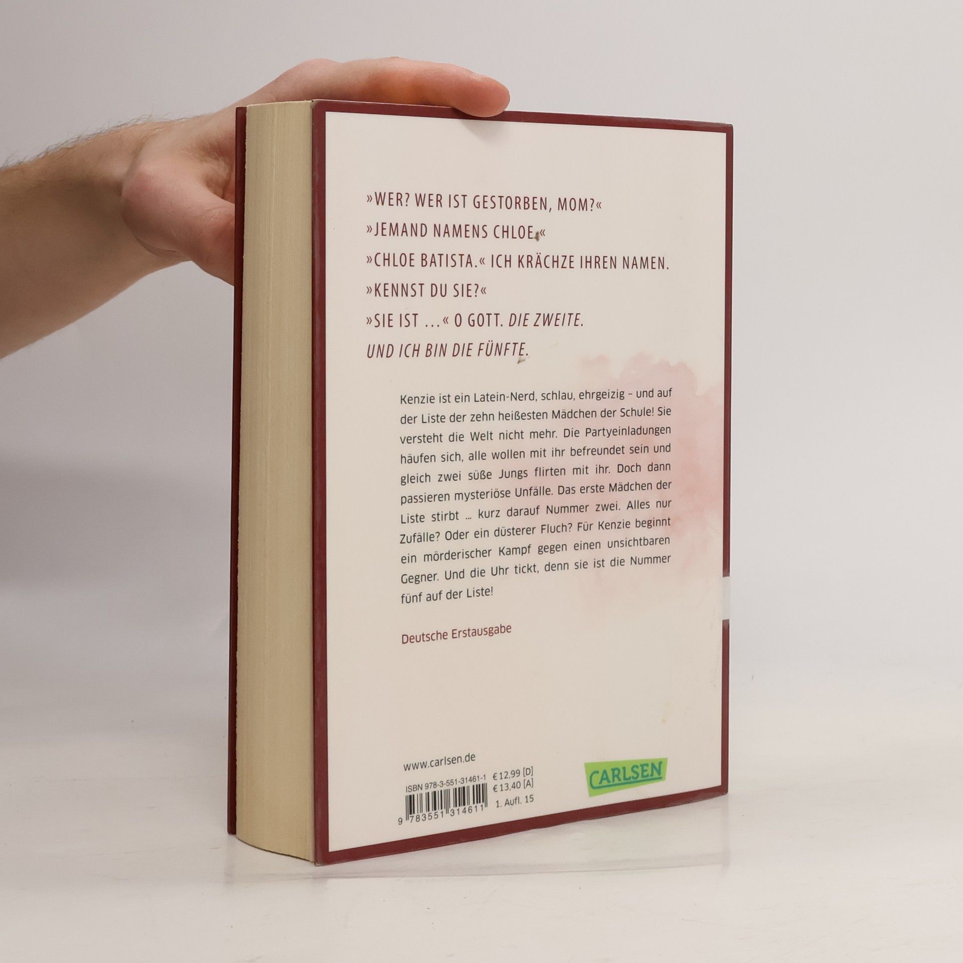 Kenzie ist ein Latein-Nerd, schlau, ehrgeizig - und auf der Liste der zehn heißesten Mädchen der Schule! Sie versteht die Welt nicht mehr. Die Partyeinladungen häufen sich, alle wollen mit ihr befreundet sein und gleich zwei süße Jungs flirten sie an. Doch dann passieren mysteriöse Unfälle. Das erste Mädchen der Liste stirbt … kurz darauf Nummer 2. Alles nur Zufälle? Oder ein düsterer Fluch? Für Kenzie beginnt ein mörderischer Wettkampf gegen einen unsichtbaren Gegner. Und die Uhr tickt, denn sie ist die Fünfte!