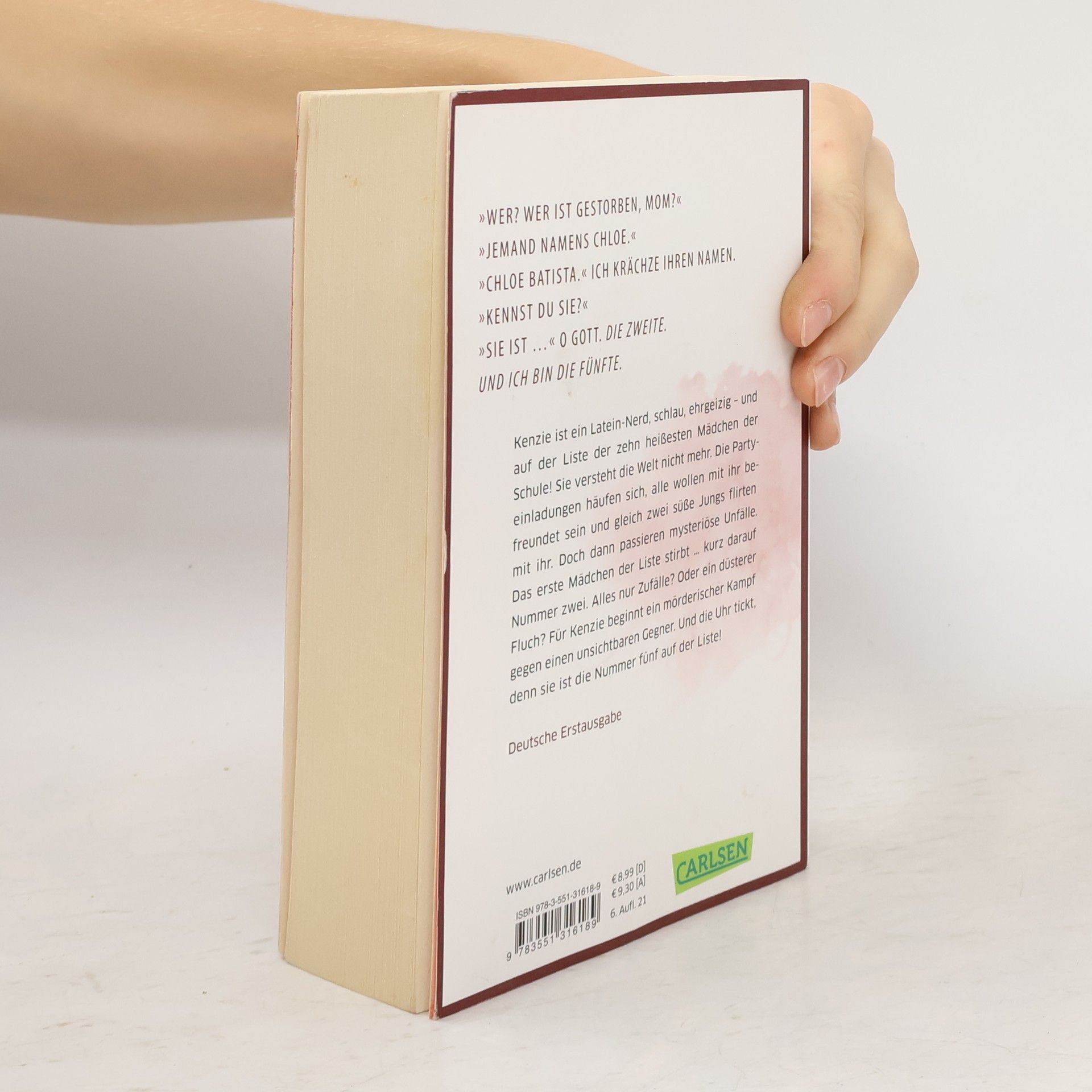 Intelligent, aufregend und atemlos spannend - ein Jugendthriller für Fans von Monika Feth und Janet Clark! Kenzie ist ein Latein-Nerd, schlau, ehrgeizig - und auf der Liste der zehn heißesten Mädchen der Schule! Sie versteht die Welt nicht mehr. Die Partyeinladungen häufen sich, alle wollen mit ihr befreundet sein und gleich zwei süße Jungs flirten sie an. Doch dann passieren mysteriöse Unfälle. Das erste Mädchen der Liste stirbt … kurz darauf Nummer 2. Alles nur Zufälle? Oder ein düsterer Fluch? Für Kenzie beginnt ein mörderischer Wettkampf gegen einen unsichtbaren Gegner. Und die Uhr tickt, denn sie ist die Fünfte! »Dieses Buch ist ein höchst süchtig machender Roman, den man nicht weglegen kann.« Literaturblog