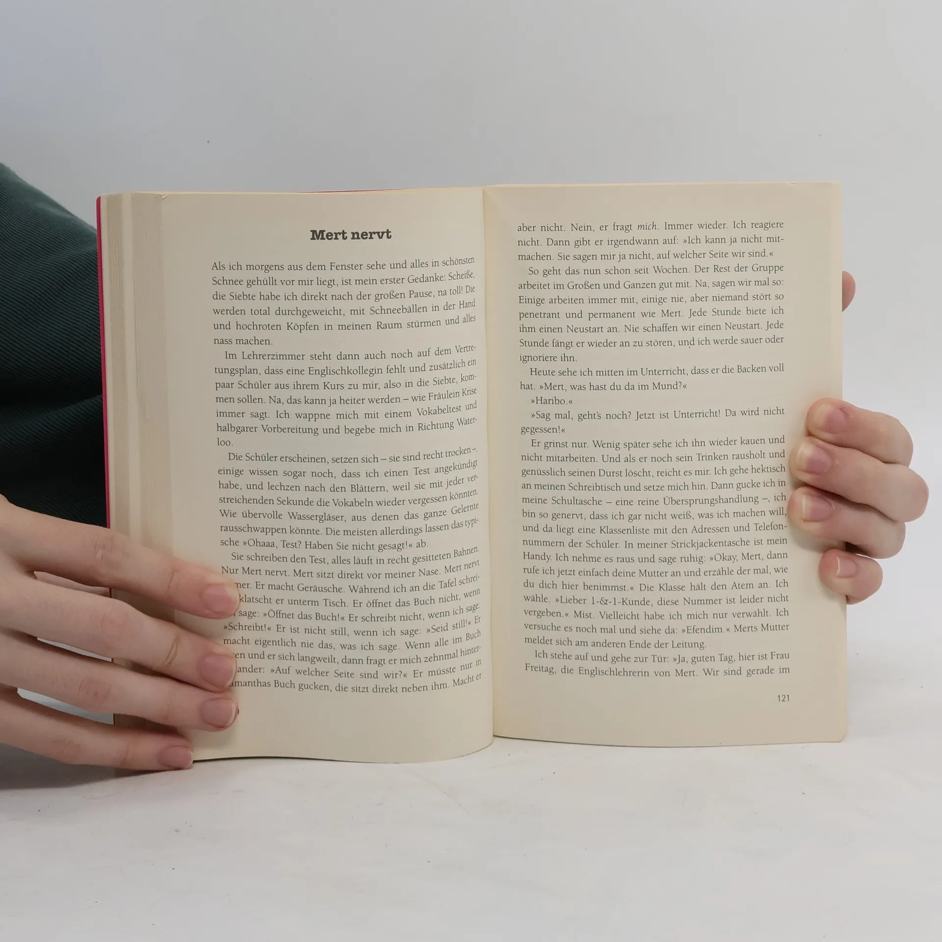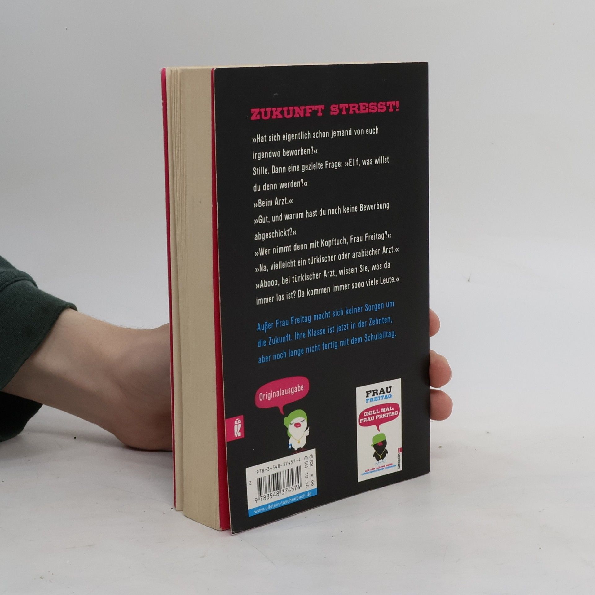»Ich schwöre, ich habe perfekt deutsch gesprochen. Ich glaube, ich habe sogar gesagt: Ich habe mein Praktikum absolviert. So spreche ich sonst nie. «Frau Freitags Klasse ist jetzt in der Zehnten. Alles dreht sich um den Abschluss. Wirklich alles? Während Frau Freitag ihre Schüler nachts auf Facebook an ihre Bewerbungen erinnert und tagsüber durch die Prüfungen schleust, haben Bilal, Emre und Mariam ganz andere Probleme: »Wie kam man eigentlich ins Internet, als es noch keine Computer gab?« – »Moment noch Frau Freitag, gleich fertig mit Handy.« – »Hab ich Selbstbräuner raufgesprüht und heute Morgen voll Schock: volldunkelbraun.« Aber wie soll eigentlich Frau Freitag ohne ihre Klasse überleben?