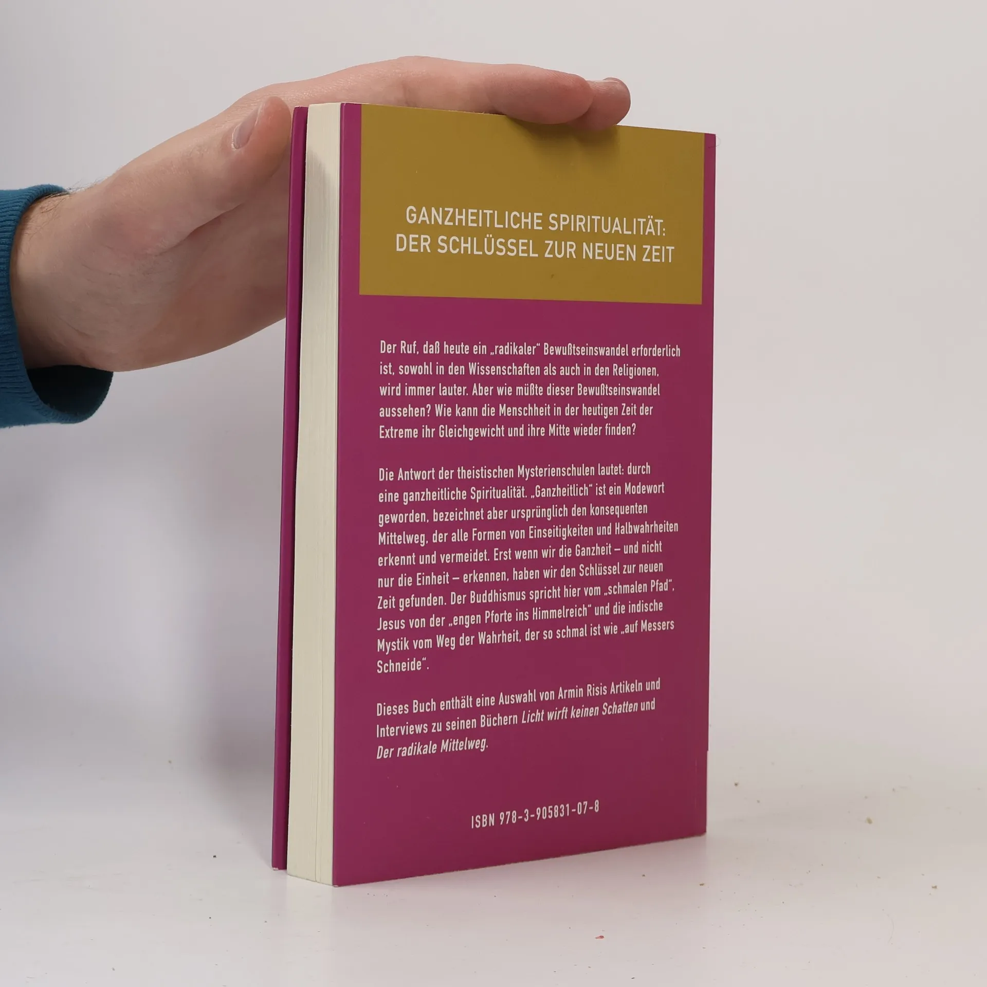 Ganzheitliche Spiritualität – der Schlüssel zur neuen Zeit. Der Ruf, daß heute ein 'radikaler' Bewußtseinswandel erforderlich ist, sowohl in den Wissenschaften als auch in den Religionen, wird immer lauter. Aber wie müßte dieser Bewußtseinswandel aussehen? Wie kann die Menschheit in der heutigen Zeit der Extreme ihr Gleichgewicht und ihre Mitte wieder finden? Die Antwort der theistischen Mysterienschulen lautet: durch eine ganzheitliche Spiritualität. 'Ganzheitlich' ist ein Modewort geworden, bezeichnet aber ursprünglich den konsequenten Mittelweg, der alle Formen von Einseitigkeiten und Halbwahrheiten erkennt und vermeidet. Erst wenn wir die Ganzheit – und nicht nur die Einheit – erkennen, haben wir den Schlüssel zur neuen Zeit gefunden. Der Buddhismus spricht hier vom 'schmalen Pfad', Jesus von der 'engen Pforte ins Himmelreich' und die indische Mystik vom Weg der Wahrheit, der so schmal ist wie 'auf Messers Schneide'. Dieses Buch enthält eine Auswahl von Armin Risis Artikeln und Interviews zu seinen Büchern 'Licht wirft keinen Schatten' und 'Der radikale Mittelweg'.