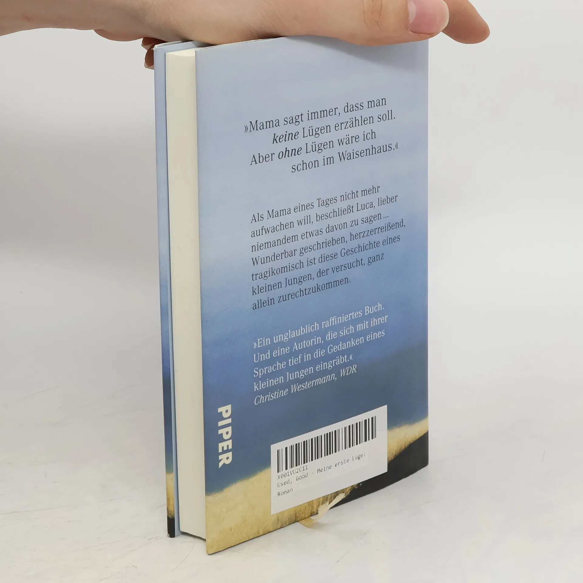 Luca ist kaum zehn Jahre alt, aber was von Waisenhäusern zu halten ist, weiß er genau - die kennt er aus dem Fernsehen, und da will er auf keinen Fall hin. Deshalb beschließt er, niemandem zu sagen, dass im Schlafzimmer seine Mutter tot im Bett liegt. Er wird schon zurechtkommen. Schließlich ist er es gewohnt, sich um das meiste selbst zu kümmern, denn Mama war gelegentlich ein bisschen komisch, und einen Vater hat er nicht. So gut es geht versucht er, regelmäßig zu essen und einigermaßen sauber und ordentlich in der Schule zu erscheinen. Eine Zeit lang läuft alles glatt, aber dann gibt es doch ein Problem. 'Man liest ›Meine erste Lüge‹ in einem Rutsch, mit angehaltenem Atem und immer wieder überläuft es einen kalt, wie den kleinen Helden dieses Romans, der versucht, der leeren Wohnung mit weit geöffneten Fenstern Leben einzuhauchen.' La Repubblica