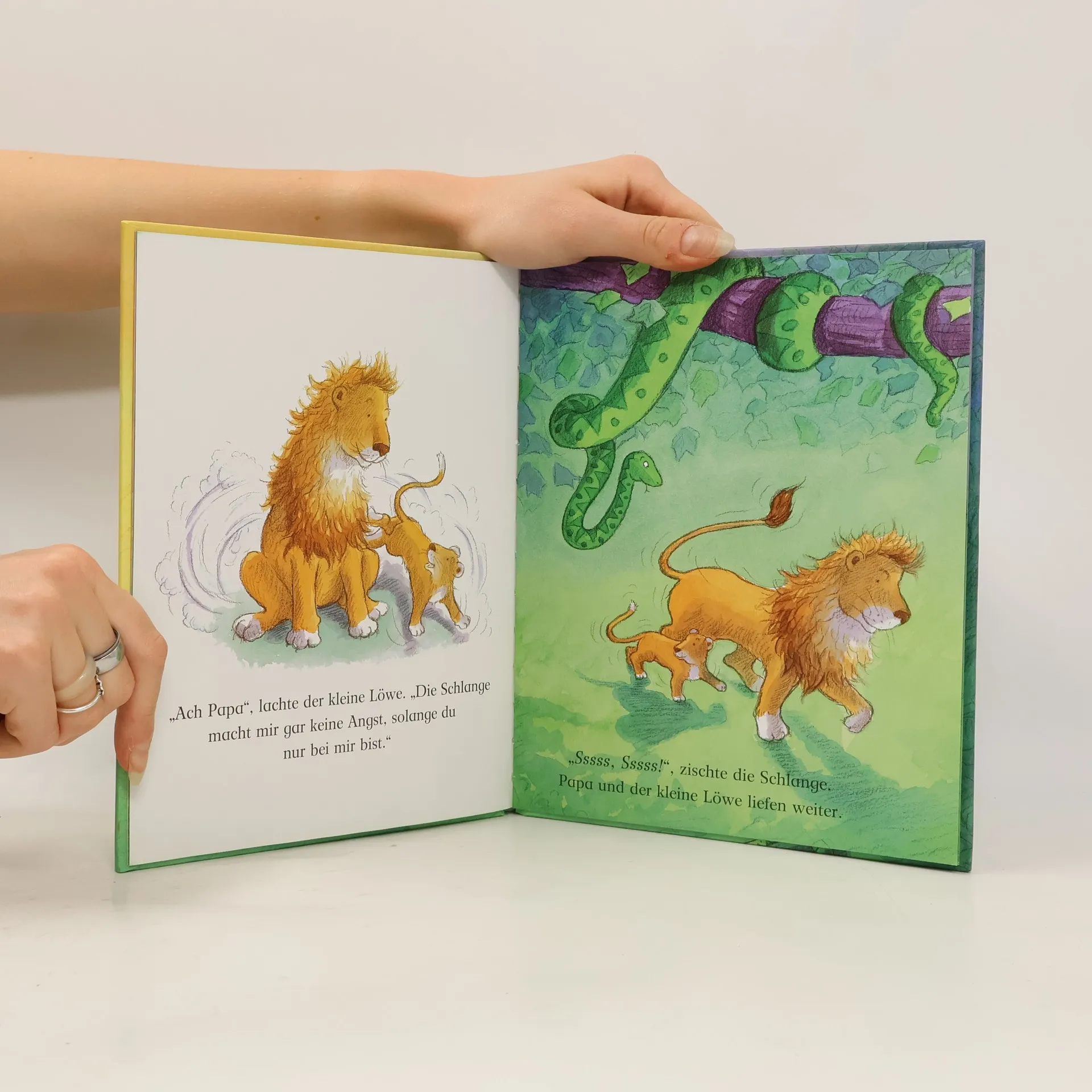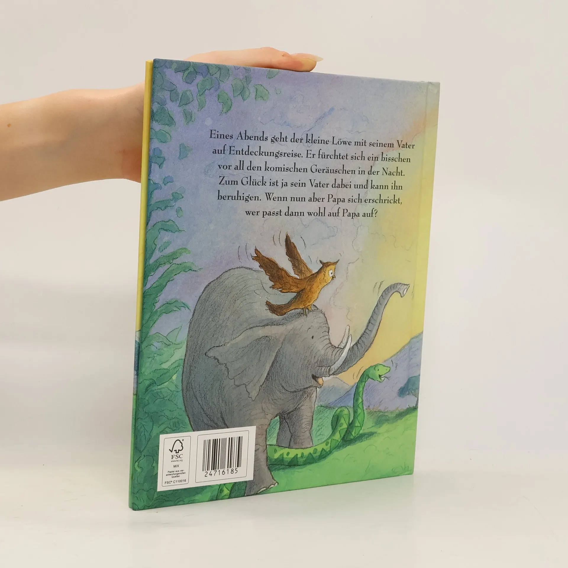 Eines Abends geht der kleine Löwe mit seinem Vater auf Entdeckungsreise. Er fürchtet sich ein bisschen vor all den komischen Geräuschen in der Nacht. Zum Glück ist ja sein Vater dabei und kann ihn beruhigen. Wenn nun aber Papa sich erschrickt, wer passt dann wohl auf Papa auf?
