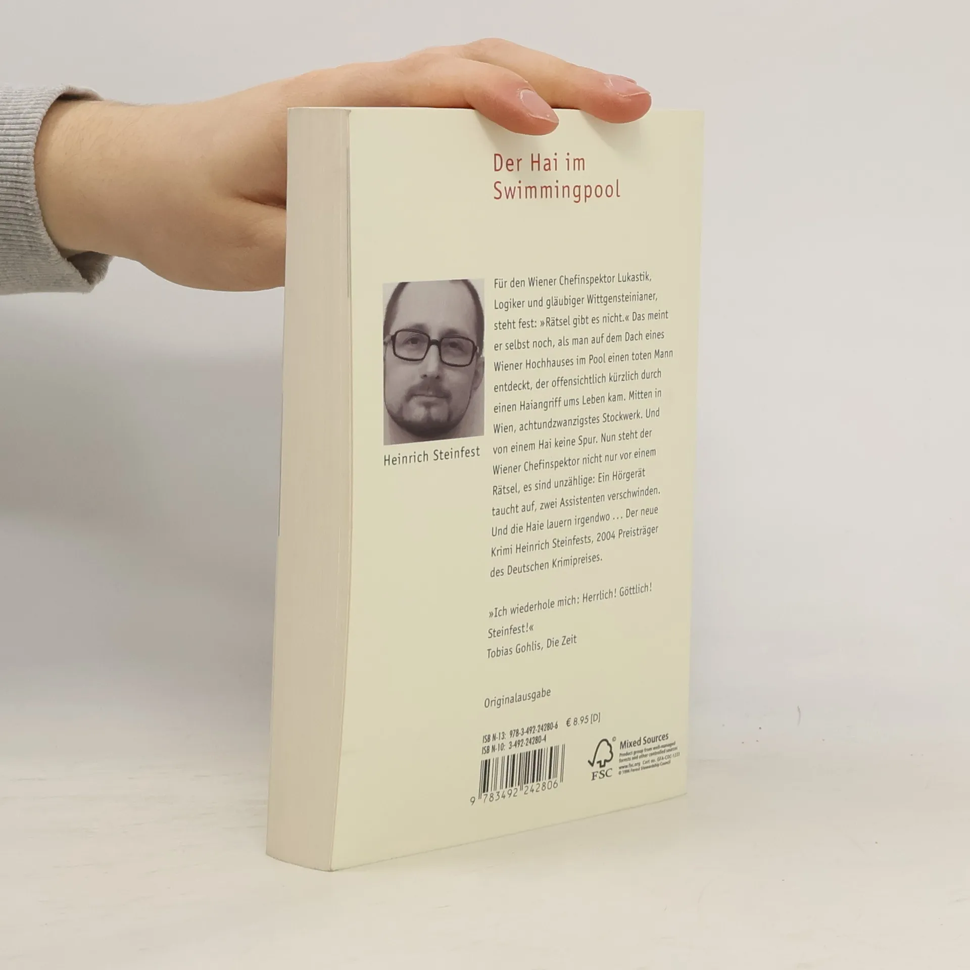 Für den Wiener Chefinspektor Lukastik, Logiker und gläubiger Wittgensteinianer, steht fest: »Rätsel gibt es nicht.« Das meint er selbst noch, als er auf dem Dach eines Wiener Hochhauses im Pool einen toten Mann entdeckt, der offensichtlich kürzlich durch einen Haiangriff ums Leben kam. Mitten in Wien, 28. Stockwerk. Und von einem Hai keine Spur. Nun steht der Wiener Chefinspektor nicht nur vor einem Rätsel, es sind unzählige: Ein Hörgerät taucht auf, zwei Assistenten verschwinden. Und die Haie lauern irgendwo …