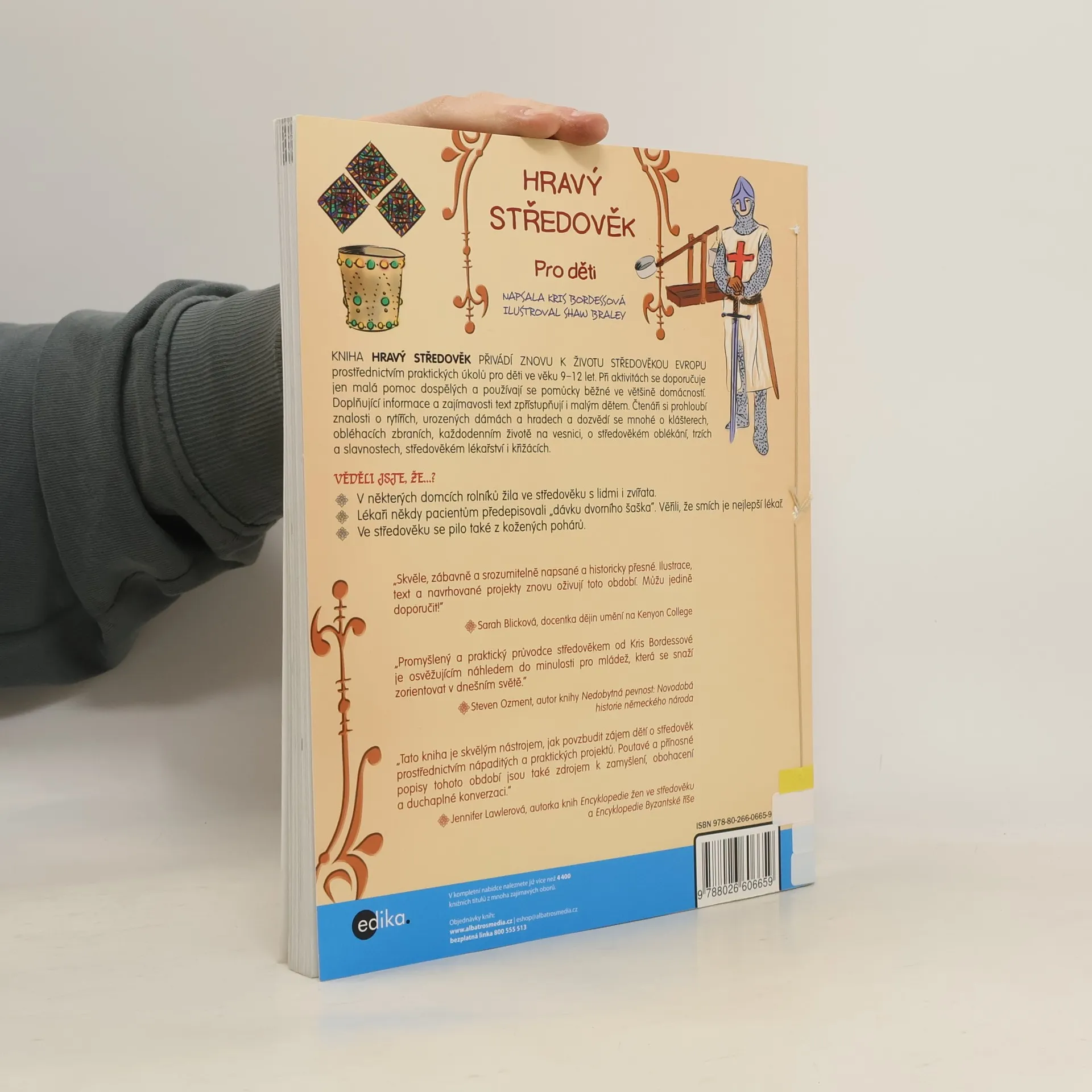 Kniha Hravý středověk přivádí znovu k životu středověkou Evropu prostřednictvím praktických úkolů pro děti ve věku 9–12 let. Při aktivitách se doporučuje jen malá pomoc dospělých a používají se pomůcky běžné ve většině domácností. Doplňující informace a zajímavosti text zpřístupňují i malým dětem. Čtenáři si prohloubí znalosti o rytířích, urozených dámách a hradech a dozvědí se mnohé o klášterech, obléhacích zbraních, každodenním životě na vesnici, o středověkém oblékání, trzích a slavnostech, středověkém lékařství i křižácích. VĚDĚLI JSTE, ŽE…? - V některých domcích rolníků žila ve středověku s lidmi i zvířata. - Lékaři někdy pacientům předepisovali „dávku dvorního šaška“. Věřili, že smích je nejlepší lékař. - Ve středověku se pilo také z kožených pohárů.