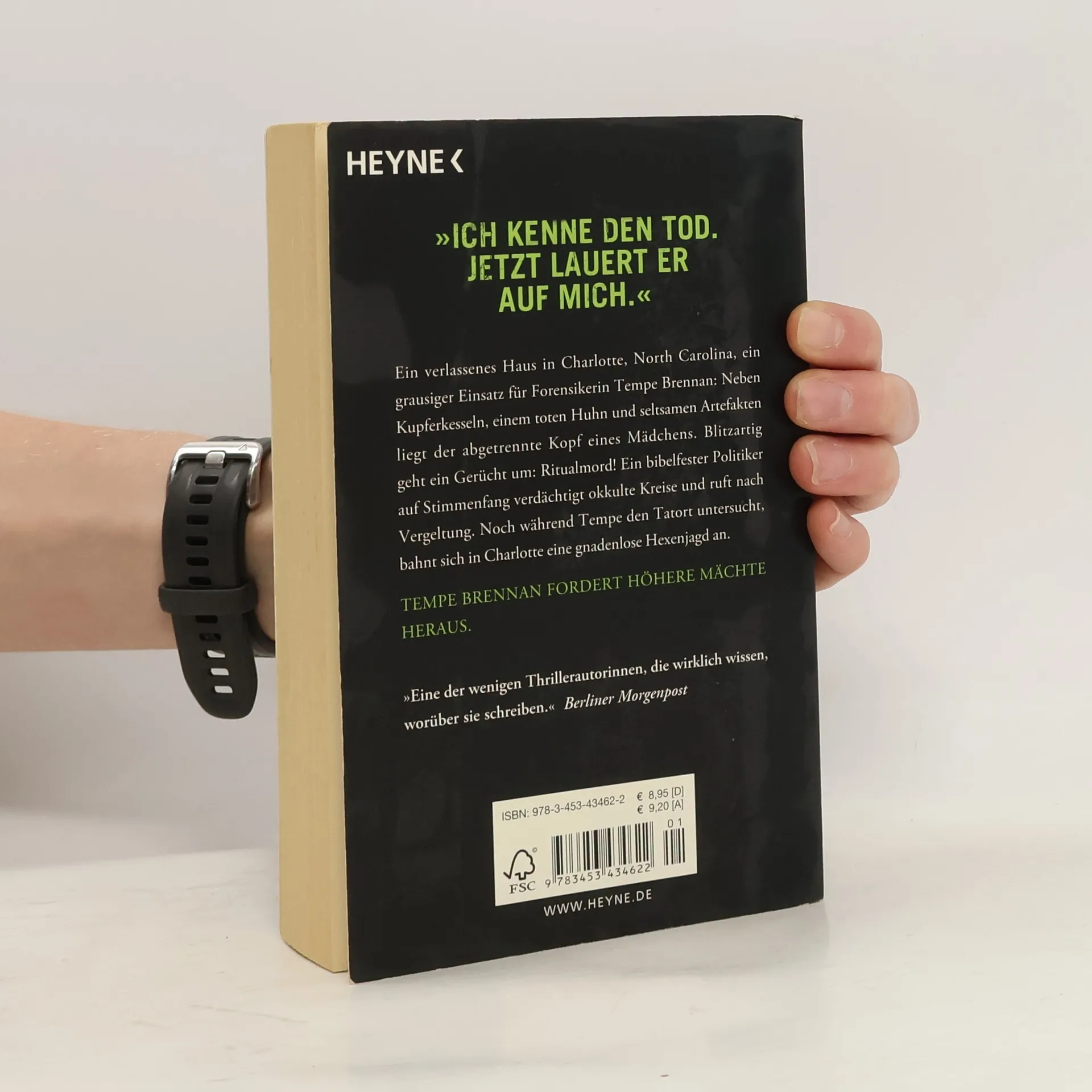 »Ich kenne den Tod. Jetzt lauert er auf mich.« Ein verlassenes Haus in Charlotte, North Carolina, ein grausiger Einsatz für Forensikerin Tempe Brennan: Neben Kupferkesseln, einem toten Huhn und seltsamen Artefakten liegt der abgetrennte Kopf eines Mädchens. Blitzartig geht ein Gerücht um: Ritualmord! Ein bibelfester Politiker auf Stimmenfang verdächtigt okkulte Kreise und ruft nach Vergeltung. Noch während Tempe den Tatort untersucht, bahnt sich in Charlotte eine gnadenlose Hexenjagd an.